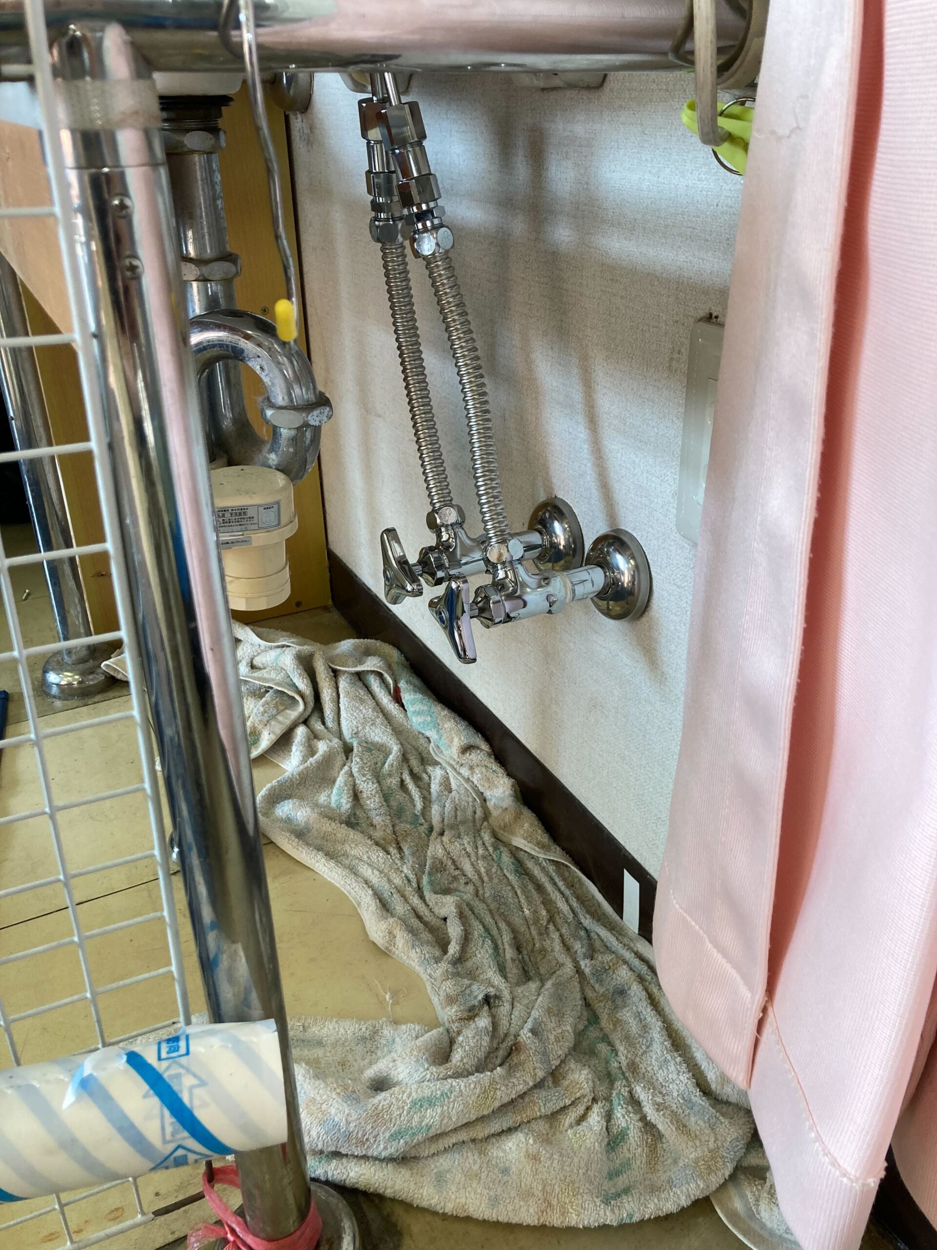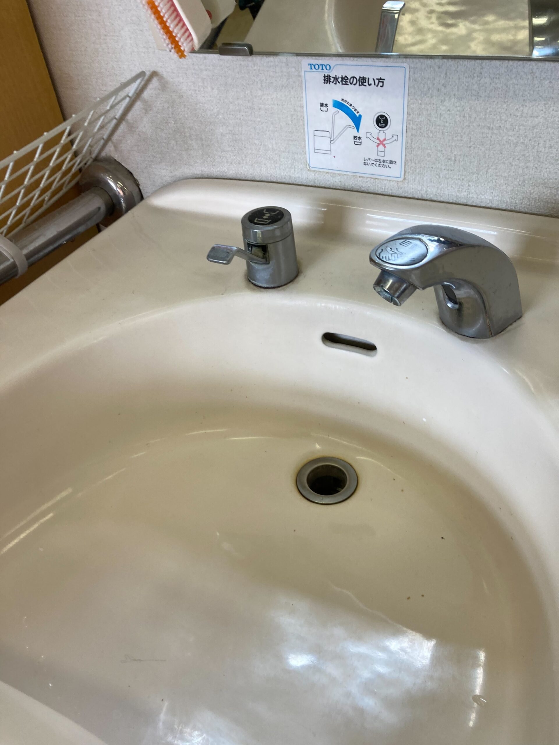 洗面台のセンサー付水栓に不具合があるとのことで、交換におうかがいしました! もともとはセンサーで吐水するタイプのものがついていましたが、今回はレバーハンドルタイプのものになりました。