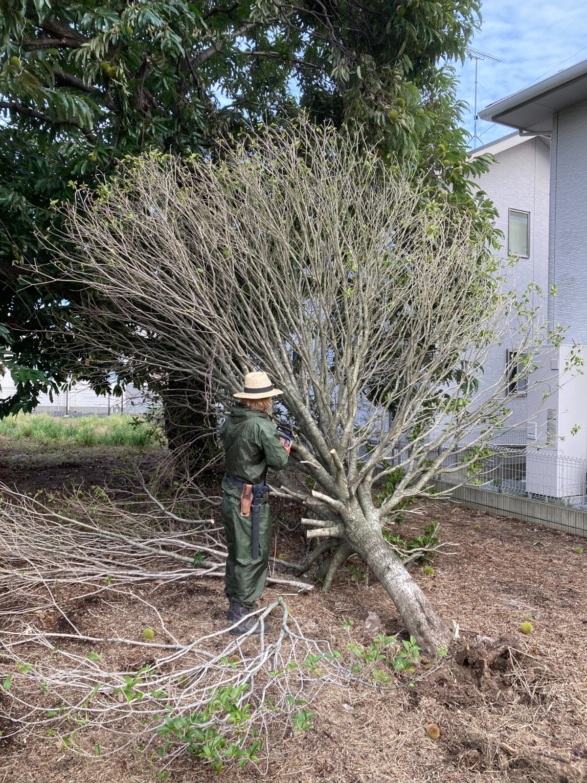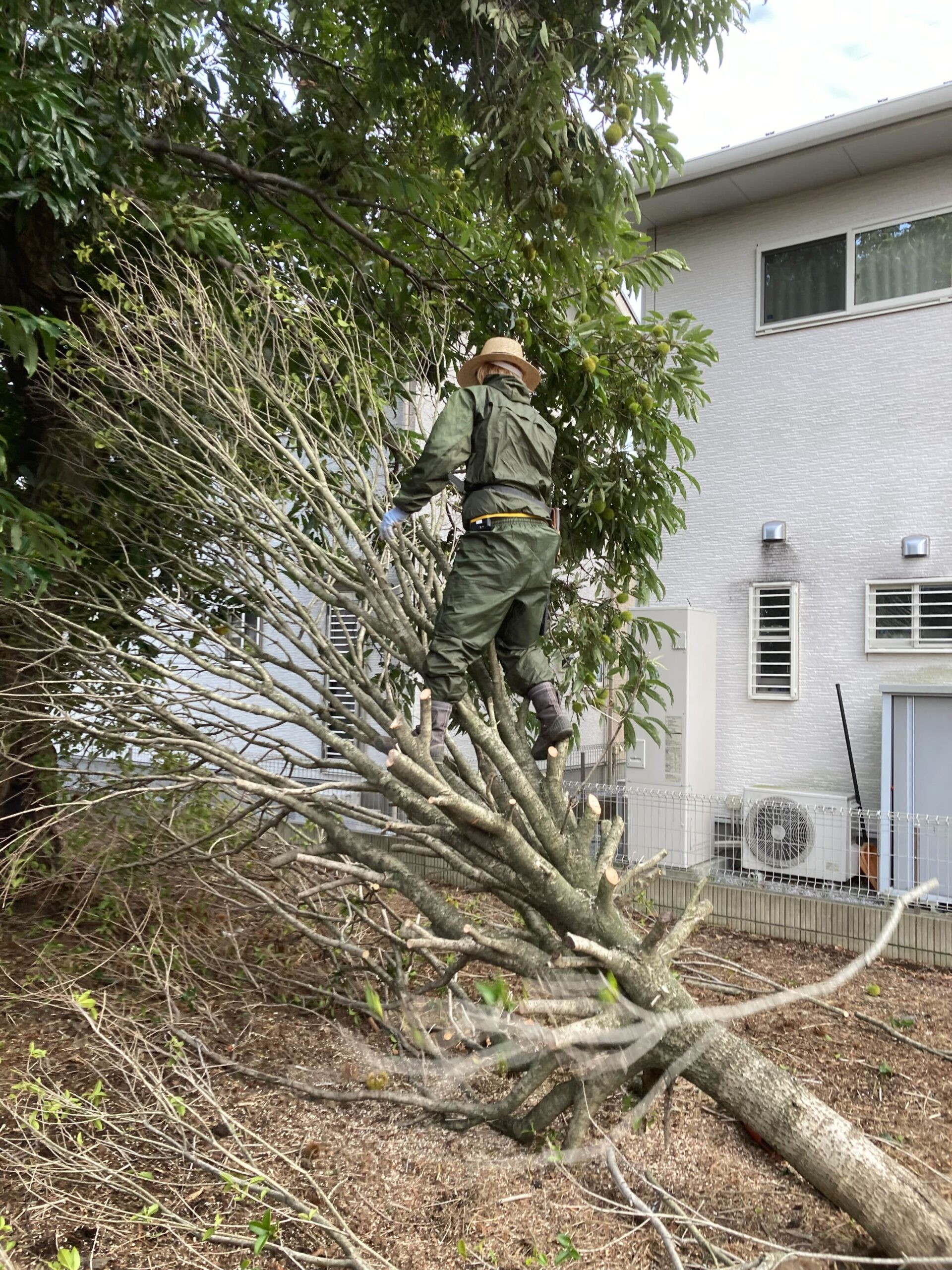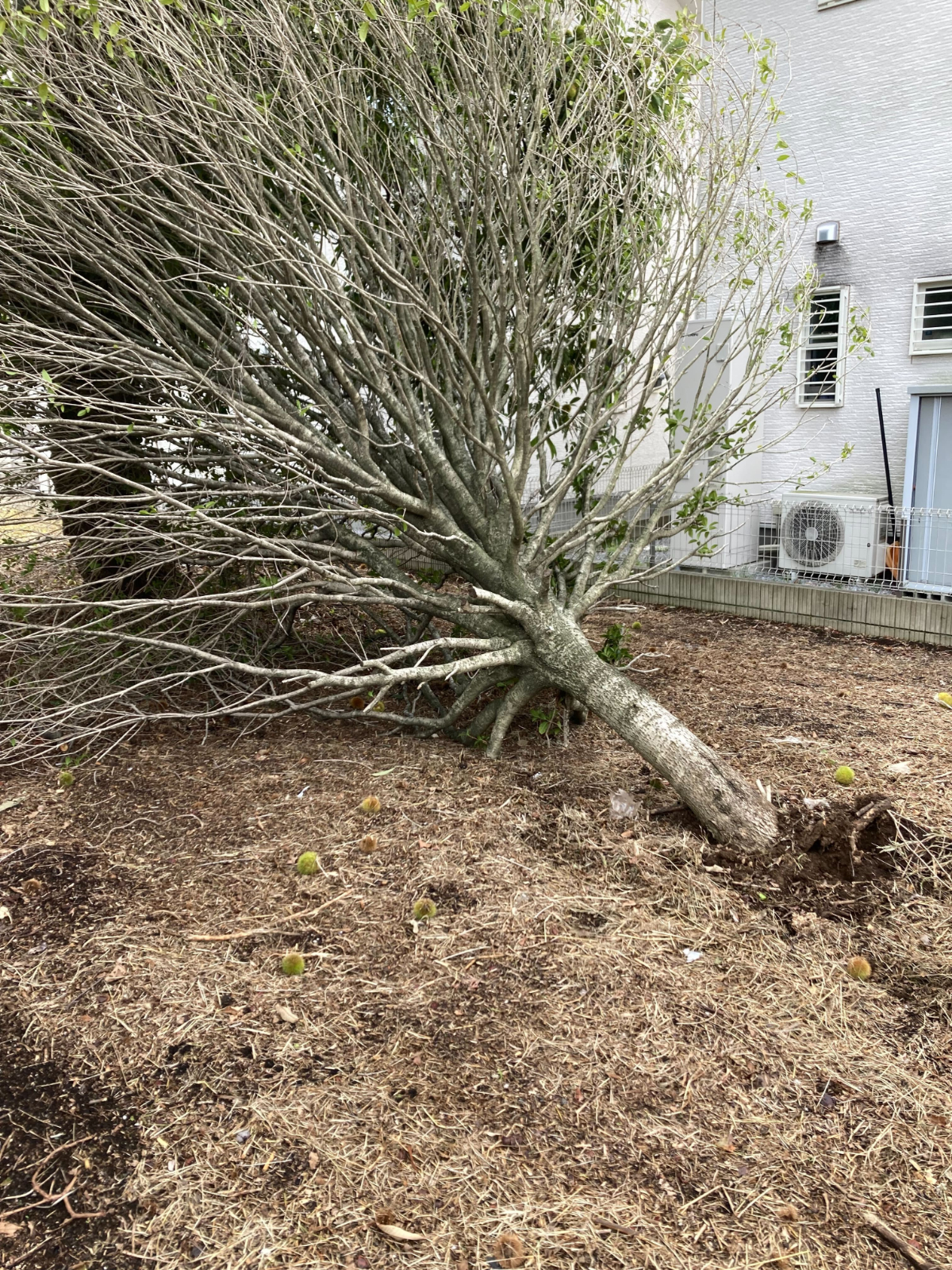 倒れた木の片付けと処分におうかがいしました。 かなり大きな木でしたので、枝から少しづつ切り、幹に取りかかっていきます。 最後に根の近くで幹を切り落とし、作業完了です。 全部まとめてトラックの荷台に積むことができました(^^♪