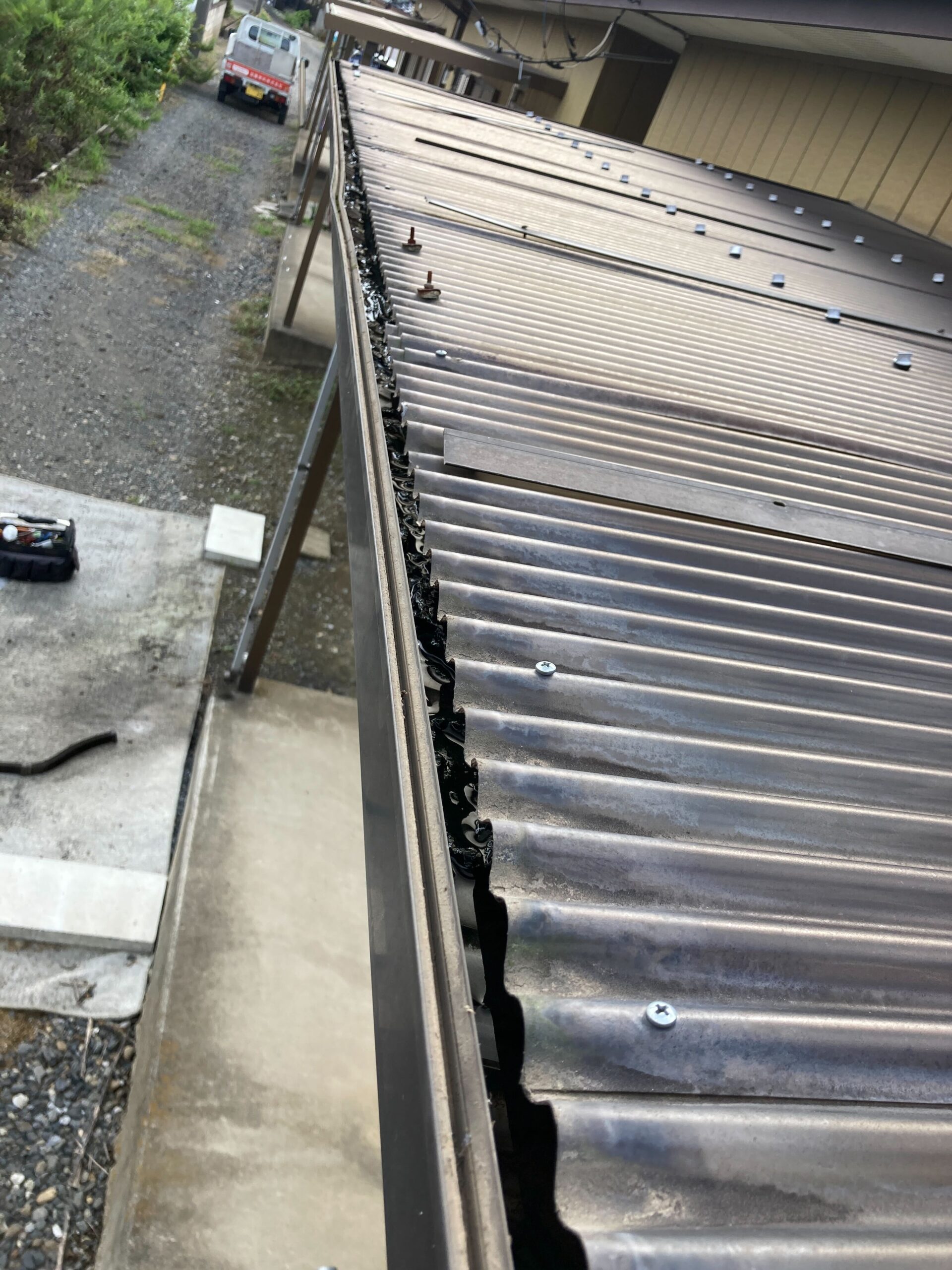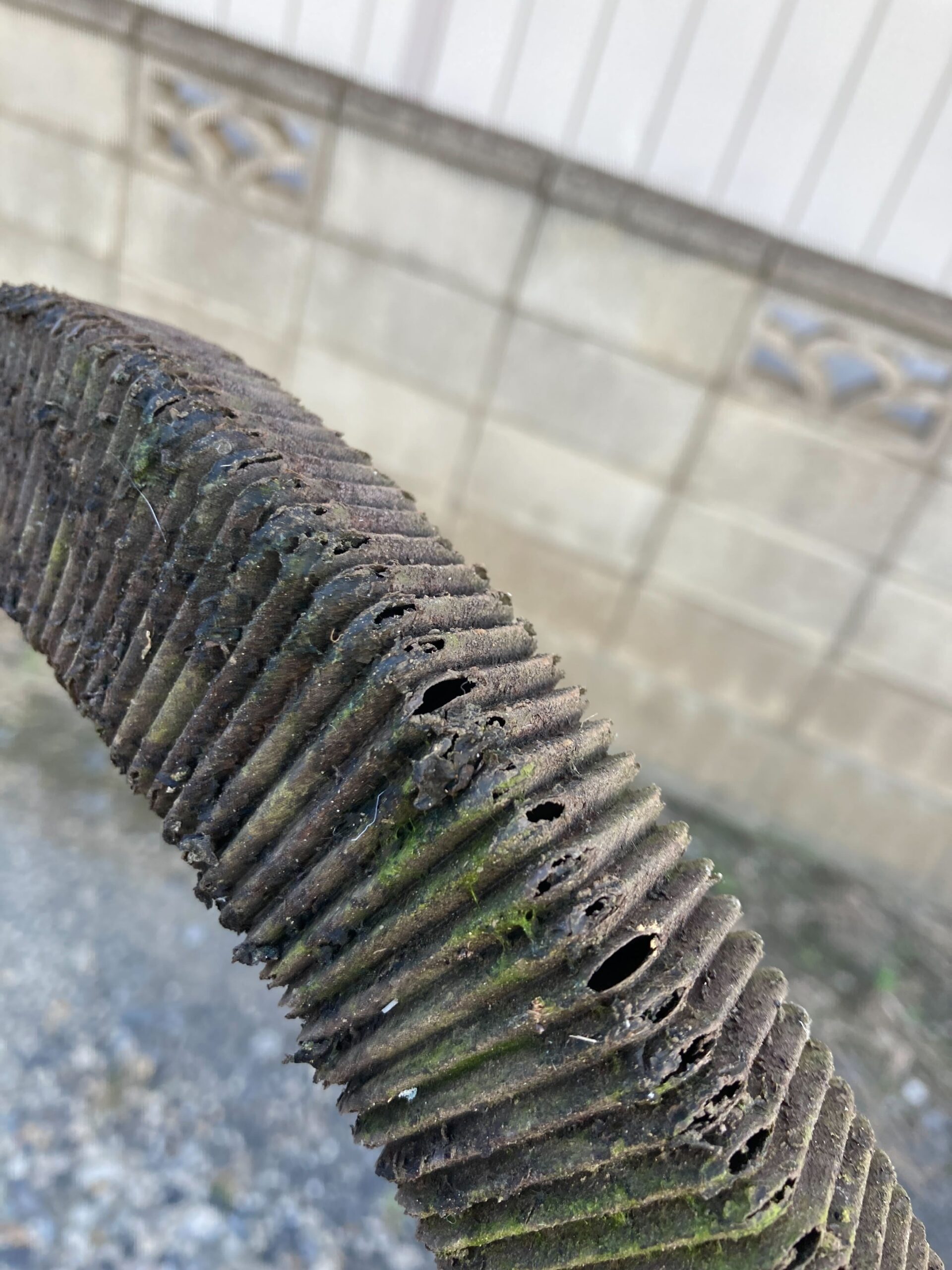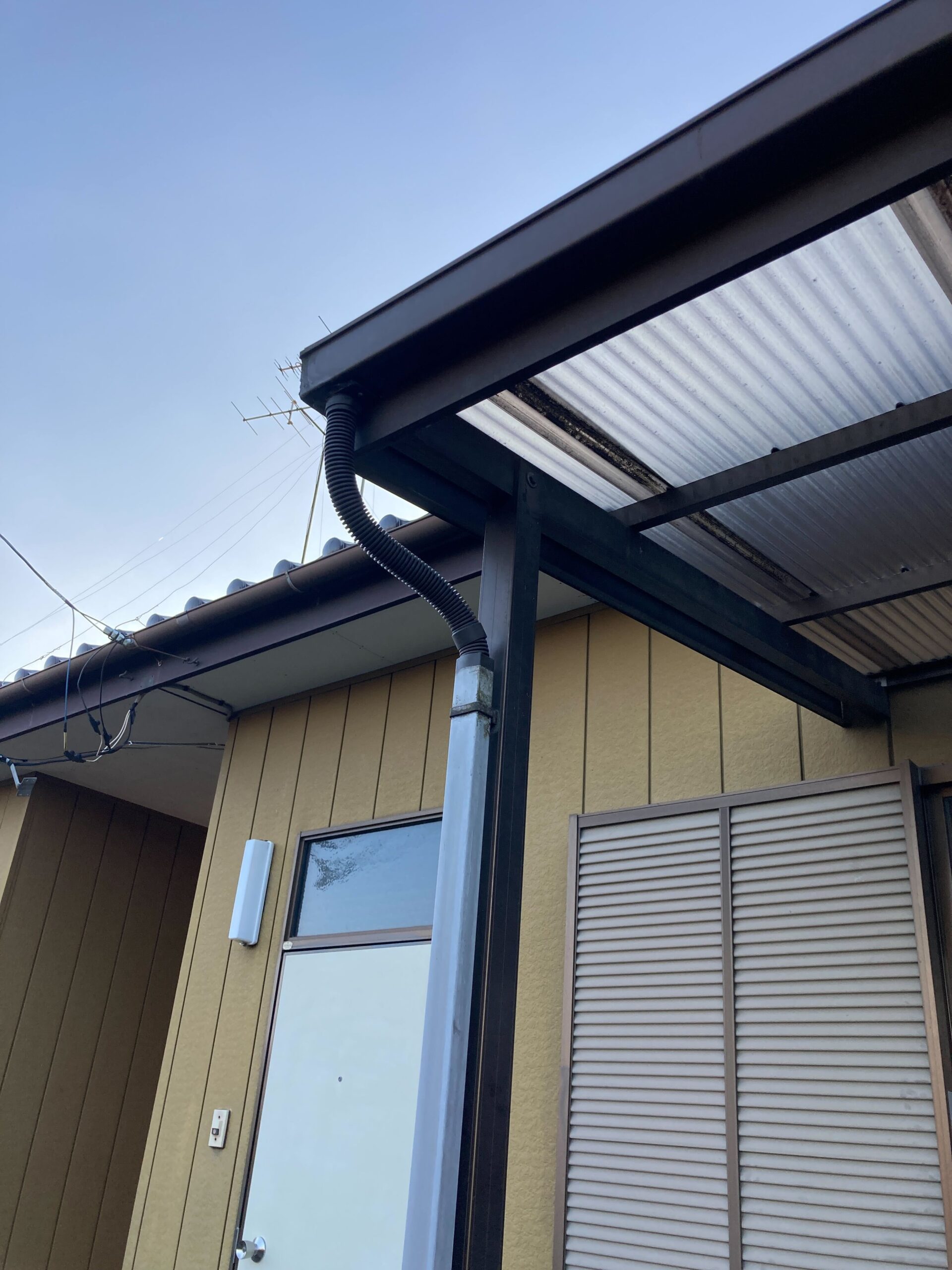 雨どいに土や砂が溜まっていたのでキレイに取り除き、水の流れ方をチェック。清掃後、流れ方の問題がないことを確認。 ジャバラの方も紫外線や雨風に晒されて、劣化していたので新しいものと交換いたしました。