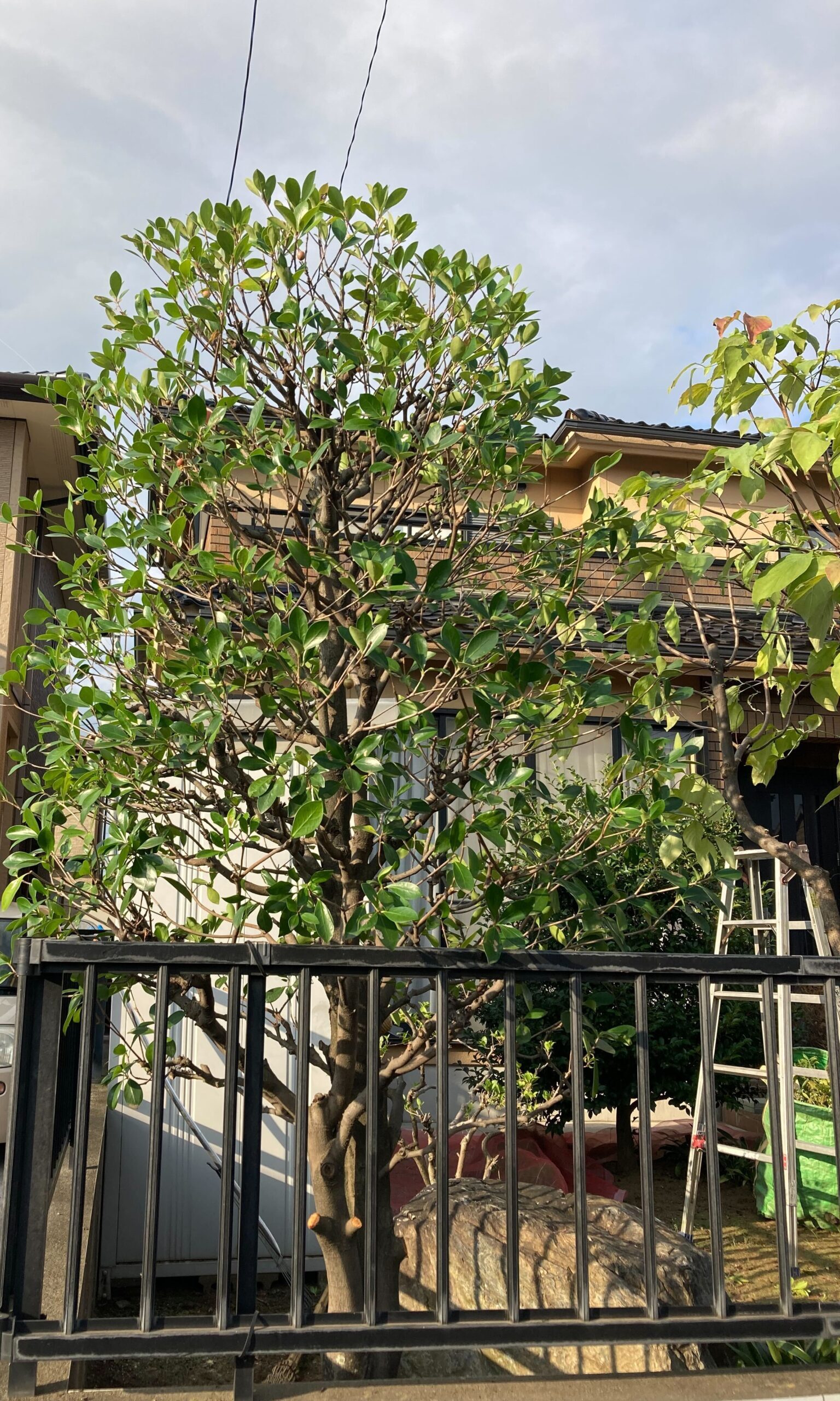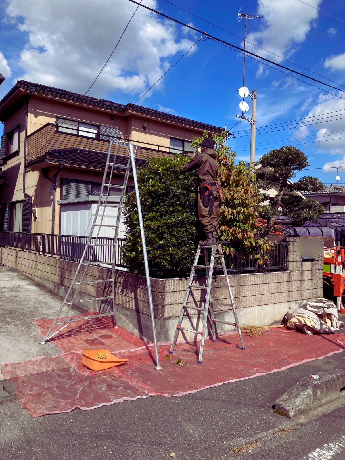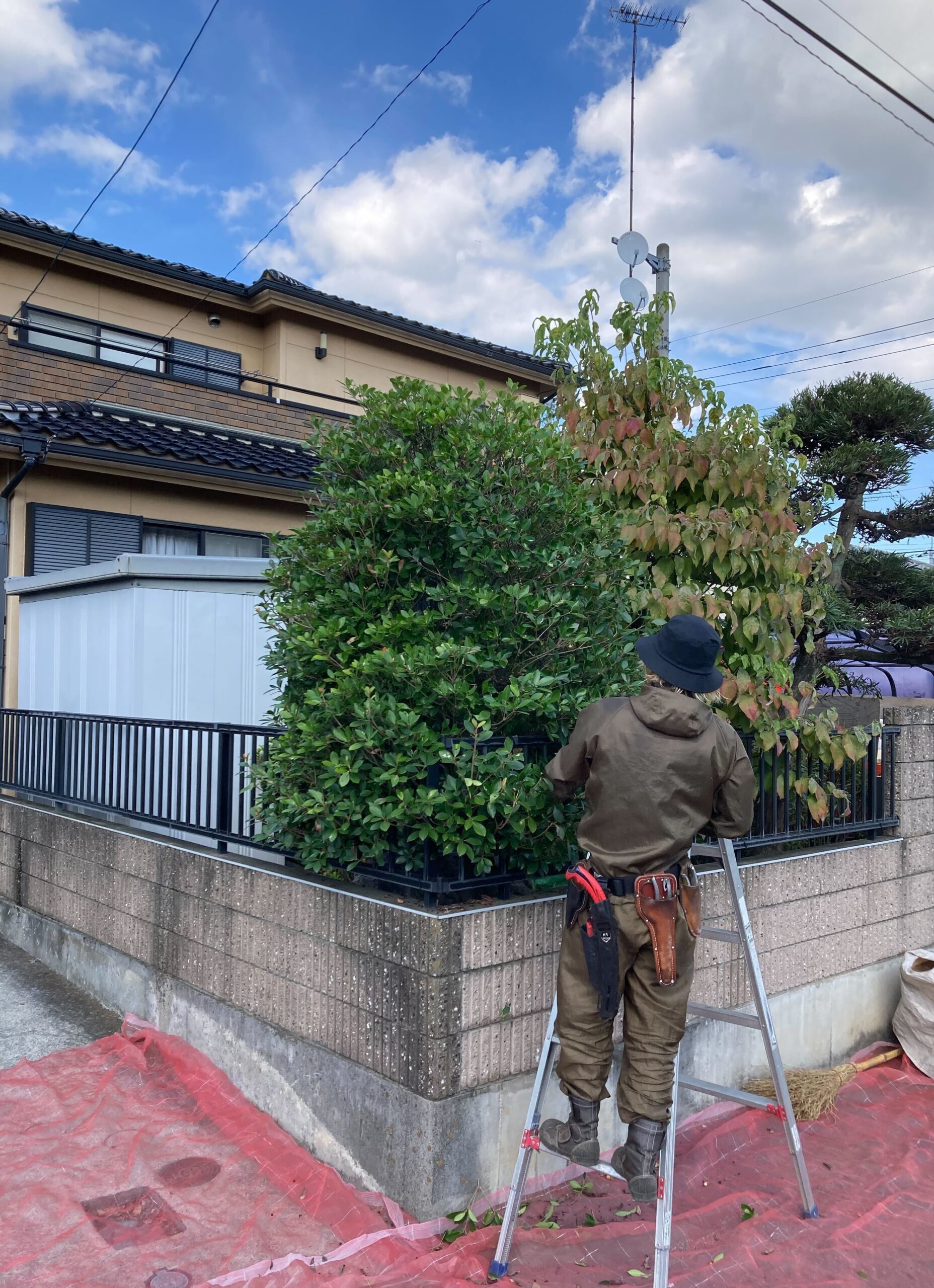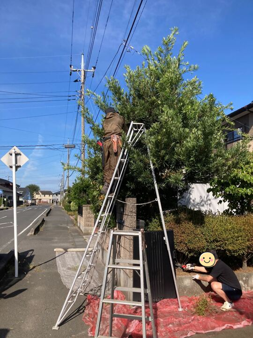 門の近くにある高さがある木はキレイに玉形に。他の高さがある塀沿いの木は透かすように剪定し、日当たりや風通しをよくするよう意識して仕上げました。 剪定作業中、ご自身でもやりたくなったご依頼主様もいっしょに作業する楽しい場面も(^^♪