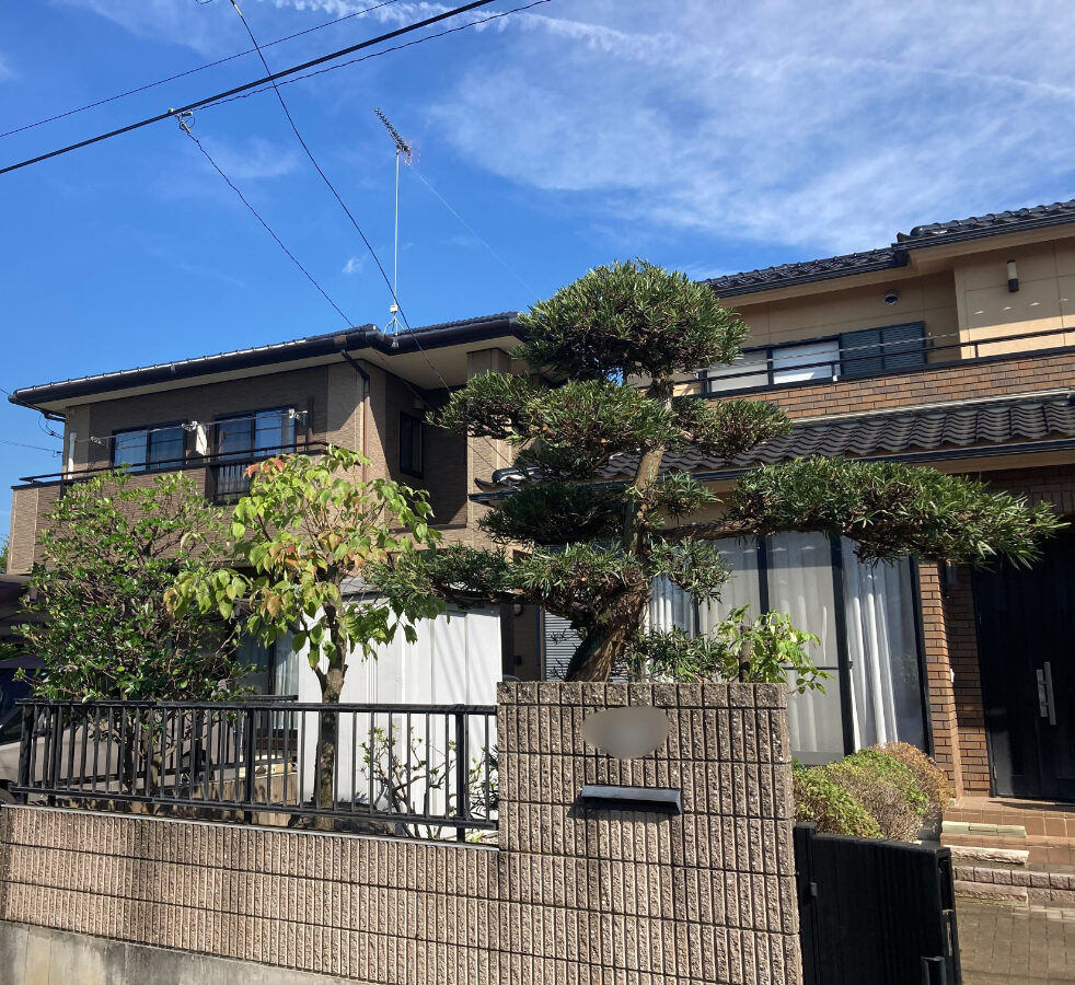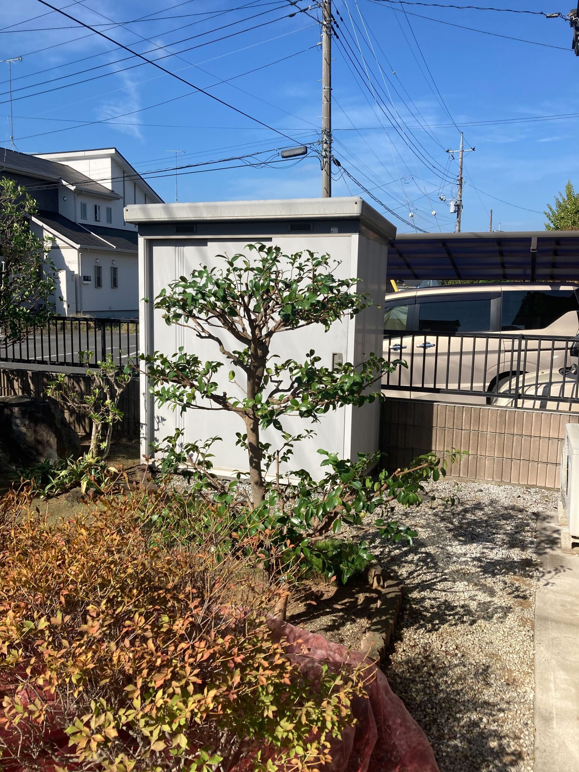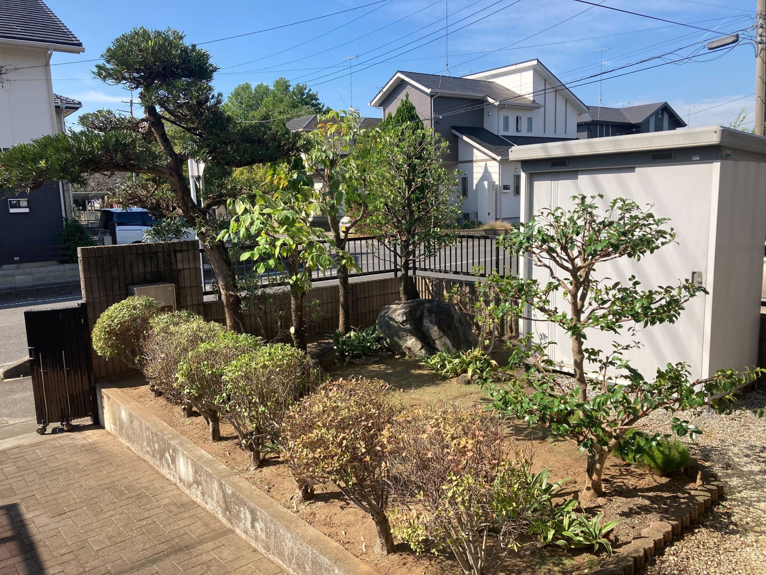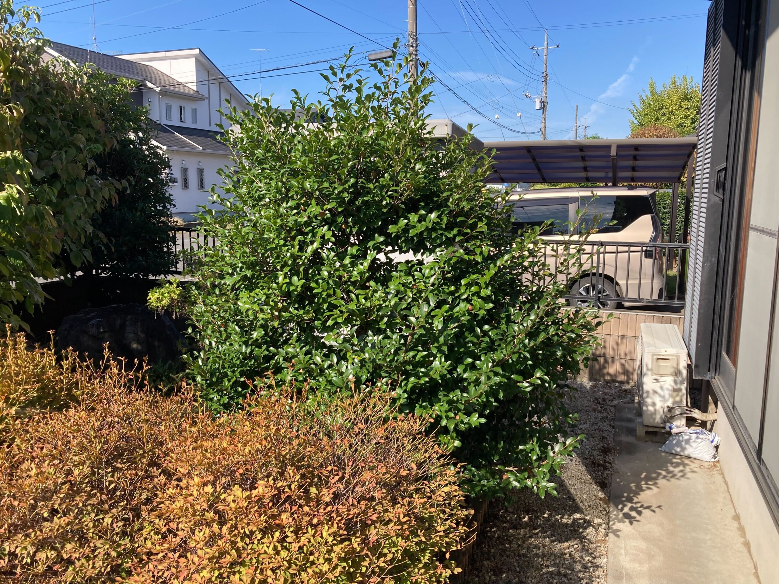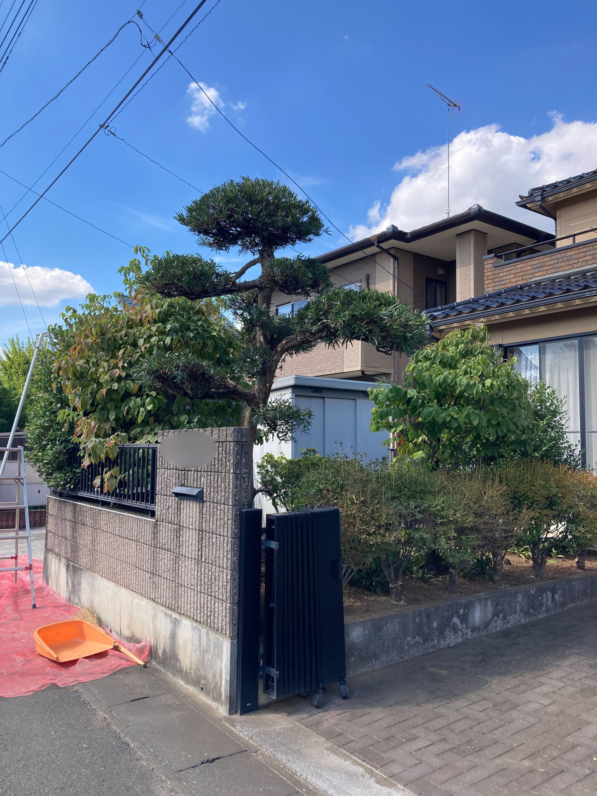 門の近くにある高さがある木はキレイに玉形に。他の高さがある塀沿いの木は透かすように剪定し、日当たりや風通しをよくするよう意識して仕上げました。 剪定作業中、ご自身でもやりたくなったご依頼主様もいっしょに作業する楽しい場面も(^^♪