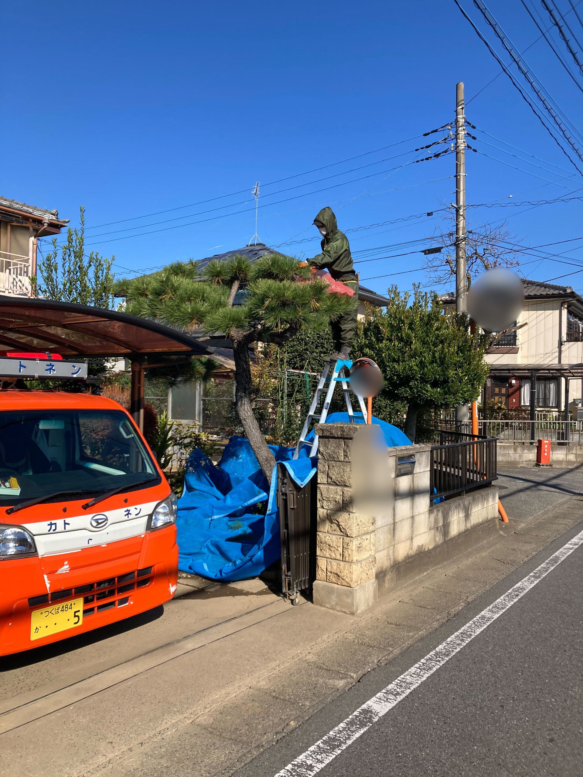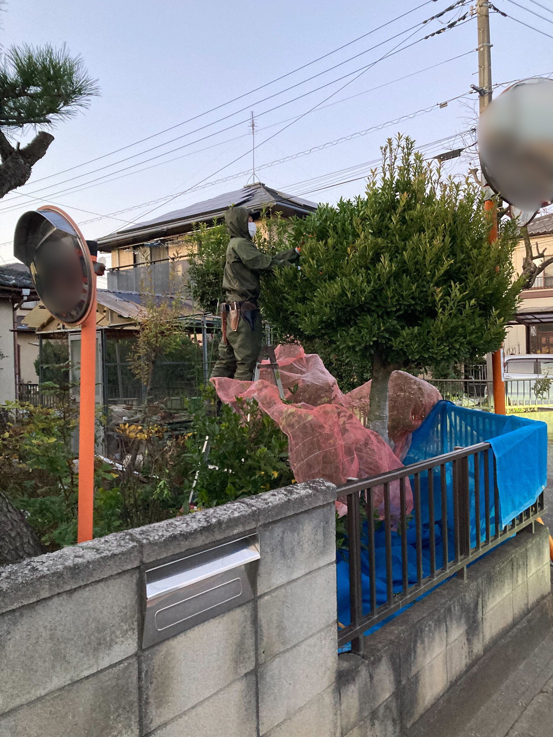 周りの木などをしっかりと保護しつつ、高い場所から枝や葉を落としていきます。 剪定する木は数本あり、どれも伸びていたので切り落とした枝や葉がすごい量でした。 最後にしっかりと片付け・清掃をして作業完了。お庭全体をみたときにスッキリとした印象になるよう仕上げさせていただきました♪