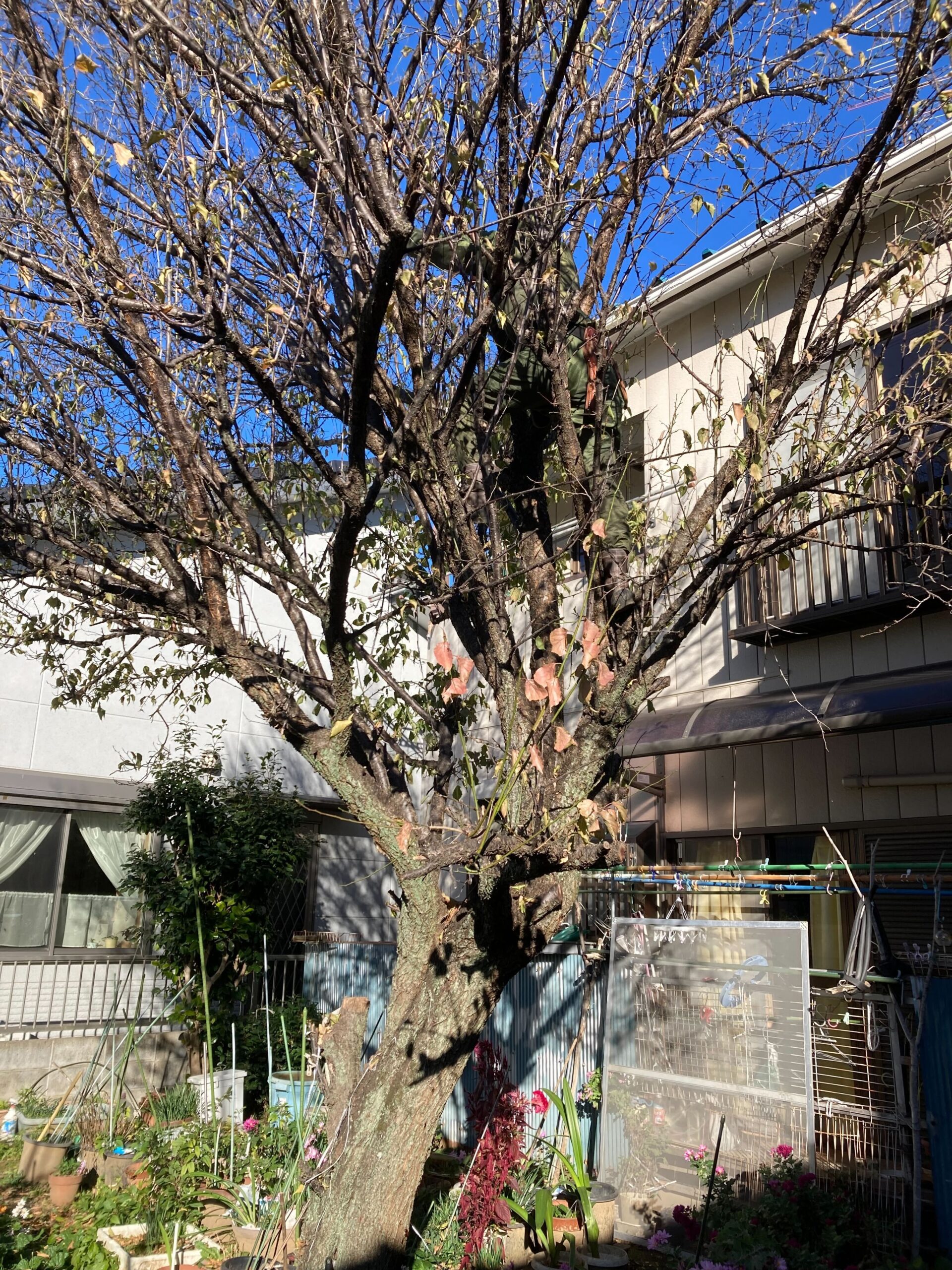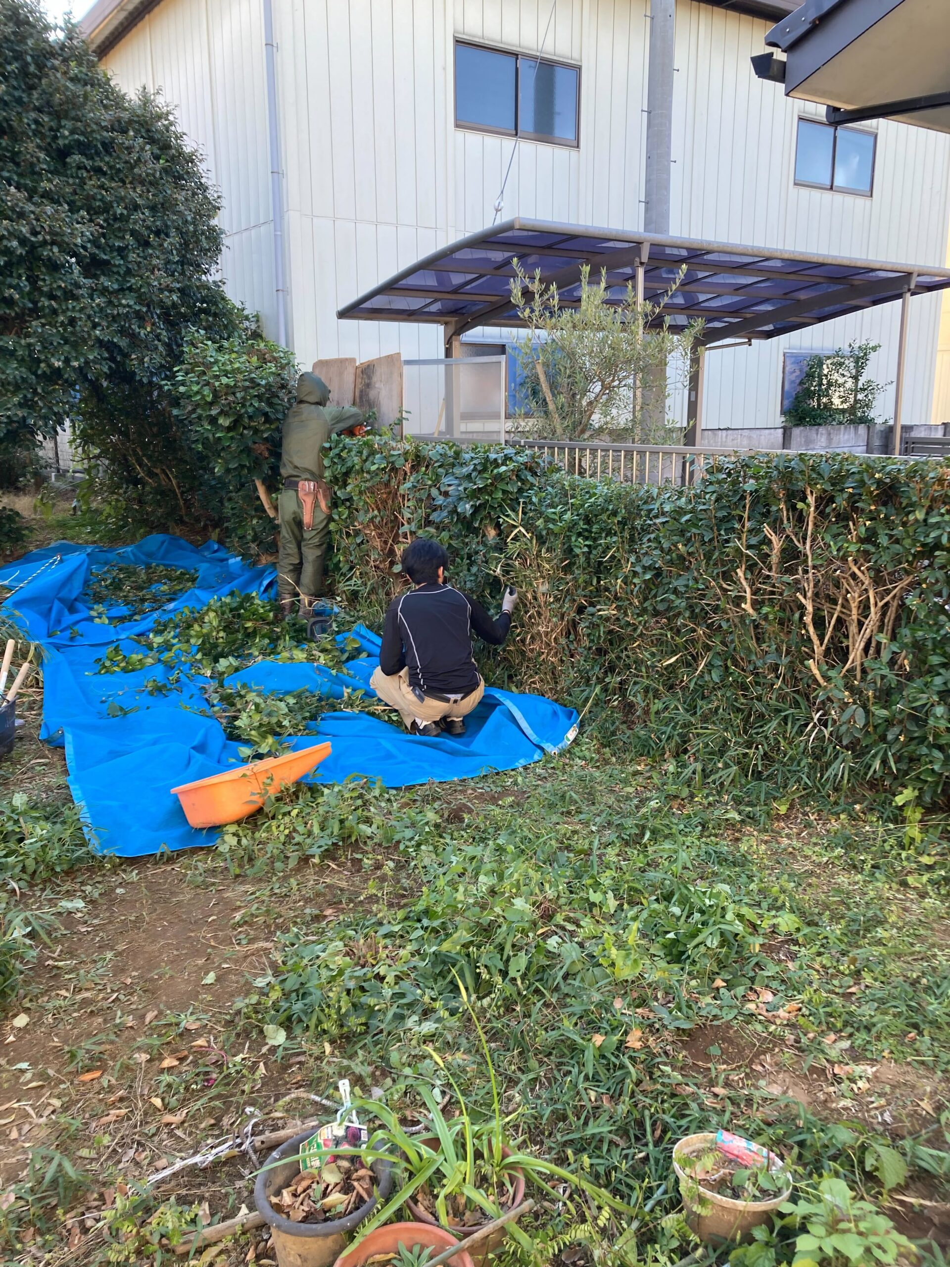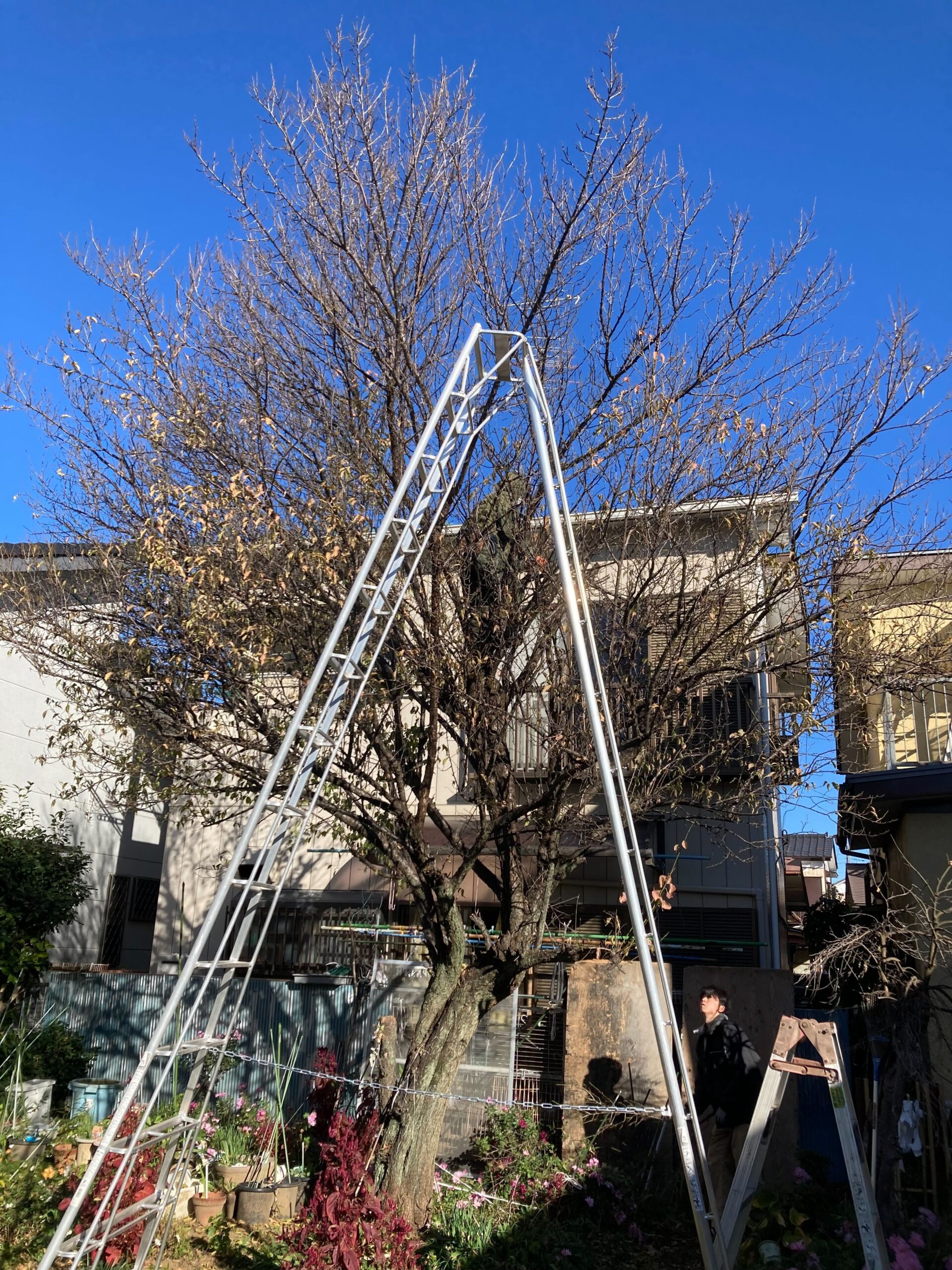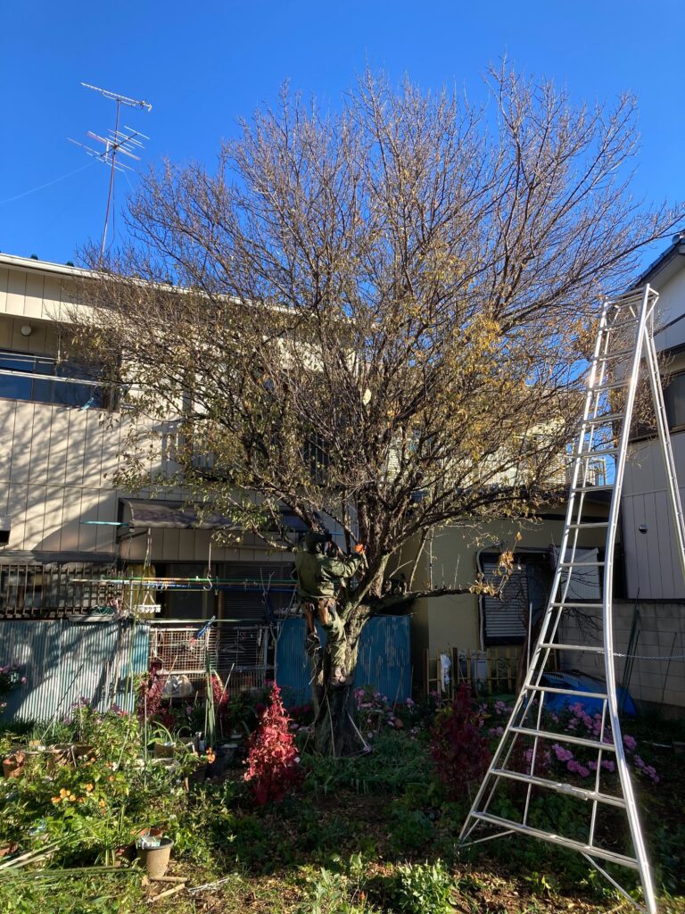 庭木の剪定におうかがいしました! お隣の家の樋に落ちた葉が溜まってしまう木があるのでその木をどうにかしたい…とご相談くださったお客様宅です。