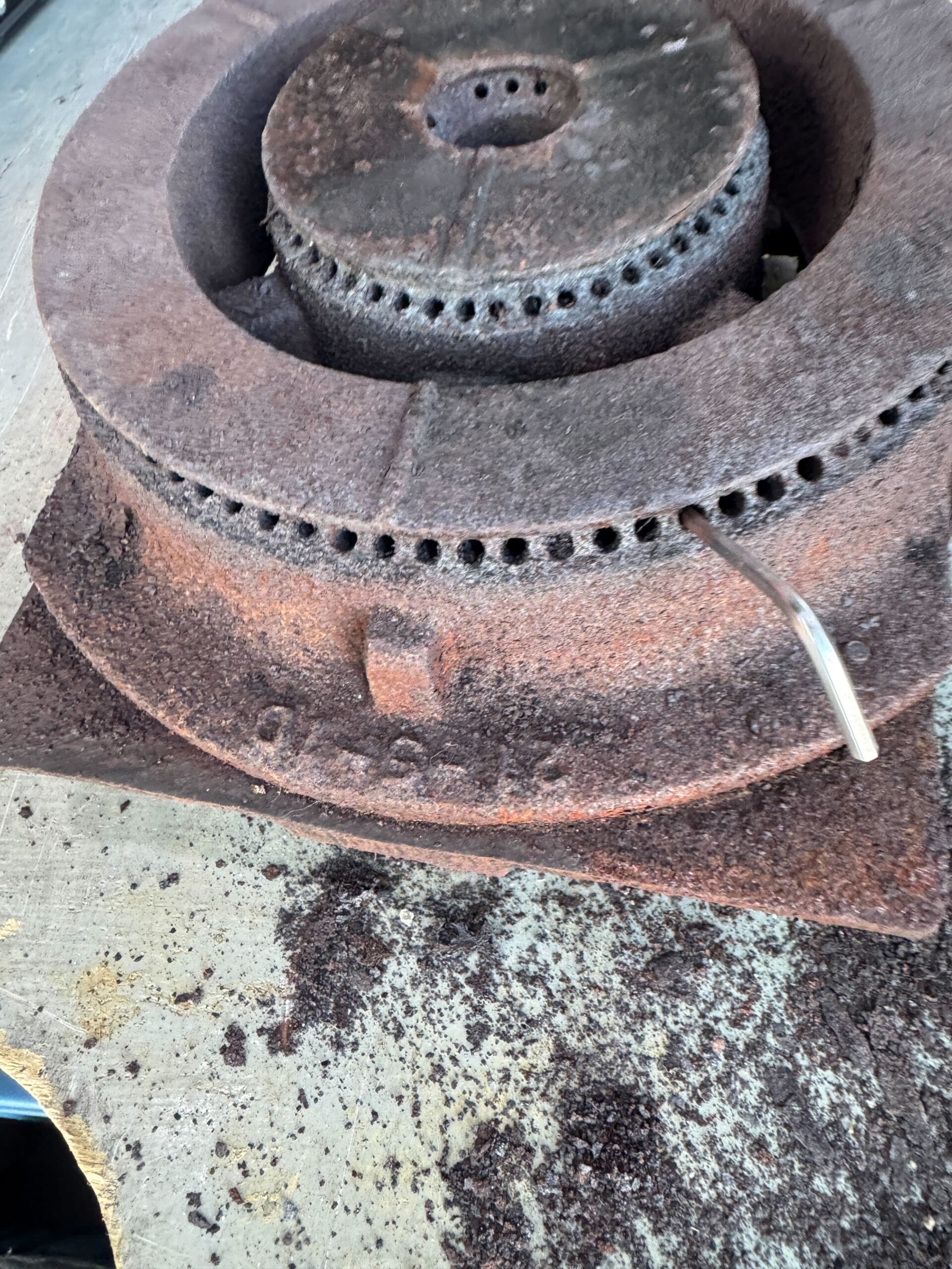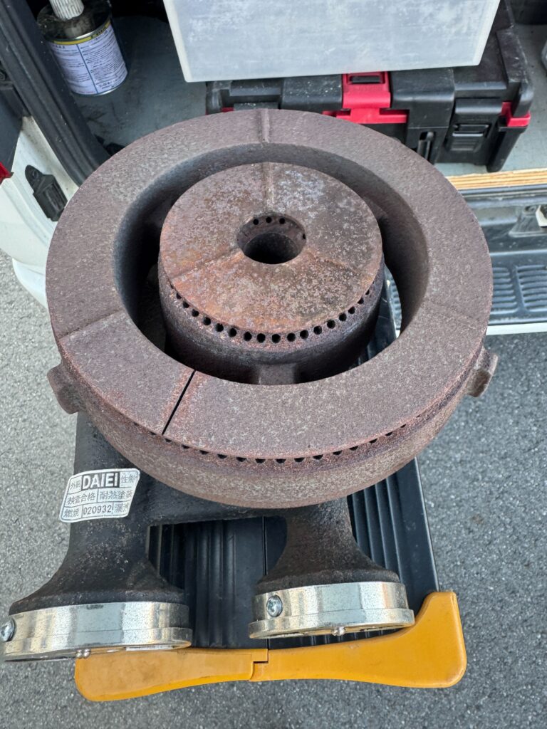 現場を確認してみると、バーナーキャップの目詰まりが原因でしたので計4つの業務用コンロのバーナーをまとめてお掃除させていただきました。 (※油汚れやこびりつきなどで目詰まりがあると赤火になり、鍋にススがついてしまう場合がございます)