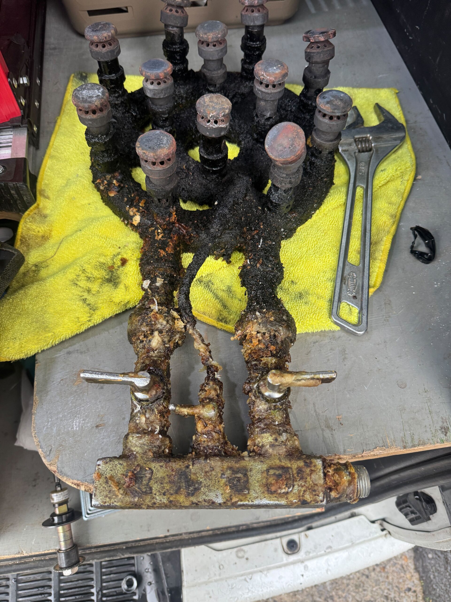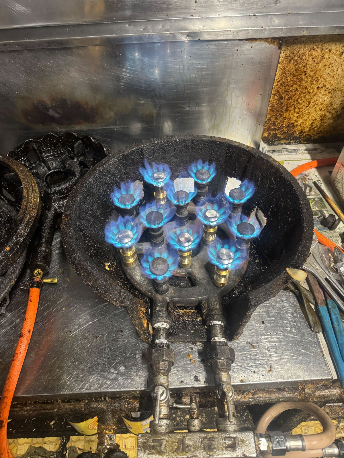 今回は市内の飲食店様よりご依頼をいただき、業務用コンロのバーナー清掃作業を行いました。 長くご使用されている業務用コンロは油汚れや焦げ付きが蓄積し、詰まりをおこし、火力の低下や点火不良の原因になることがあります。