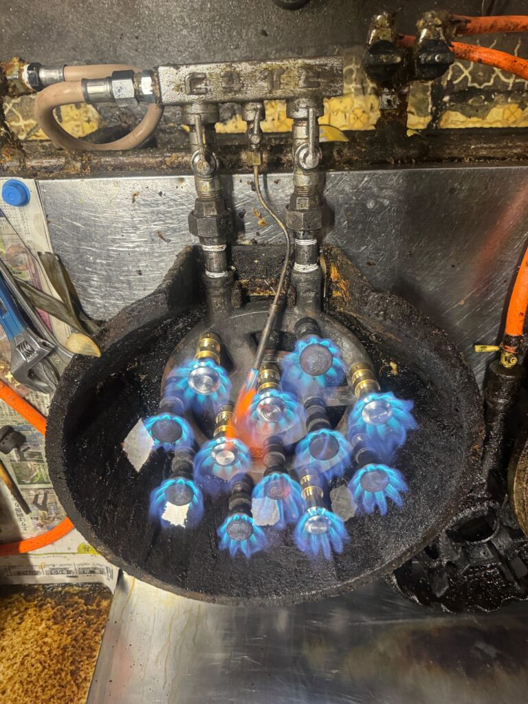今回はバーナーを一度取り外し、焼き作業によってこびり付いた汚れを落とす清掃を実施しました。 また劣化が進んでいた一部のバーナーについては、新しい部品へ交換させていただきました。 作業後は火のまわりや点き方などを確認。しっかりと改善され、安定した状態でご使用いただけるようになりました。