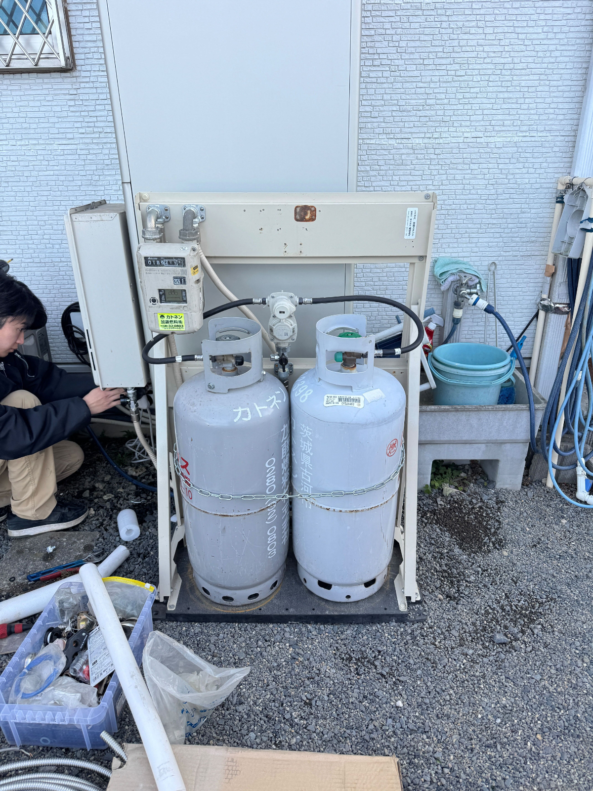 そこで今回は当面の生活に支障が出ないよう、ガスボンベと給湯器を仮設で設置する代替案をご提案・施工しました。