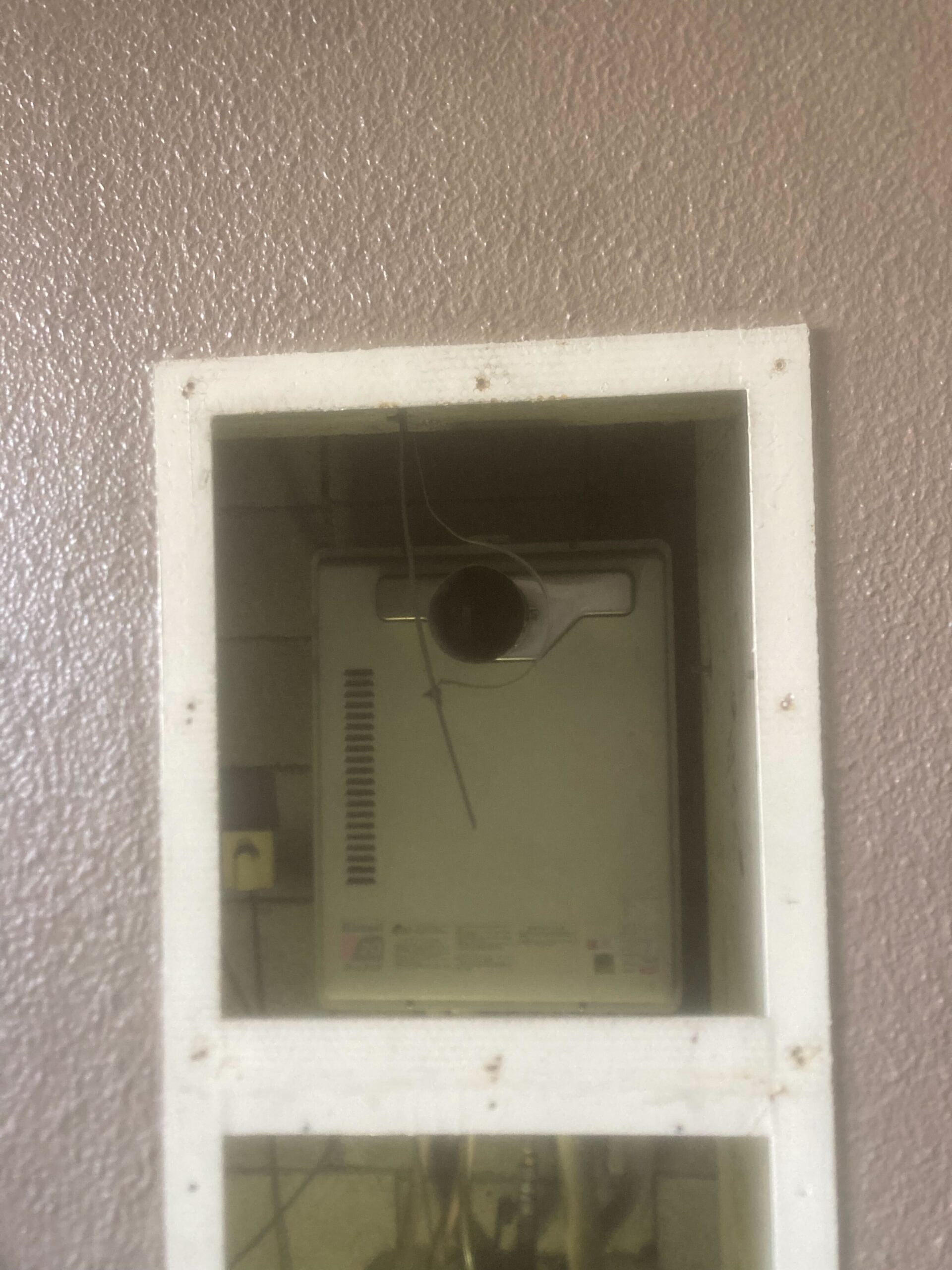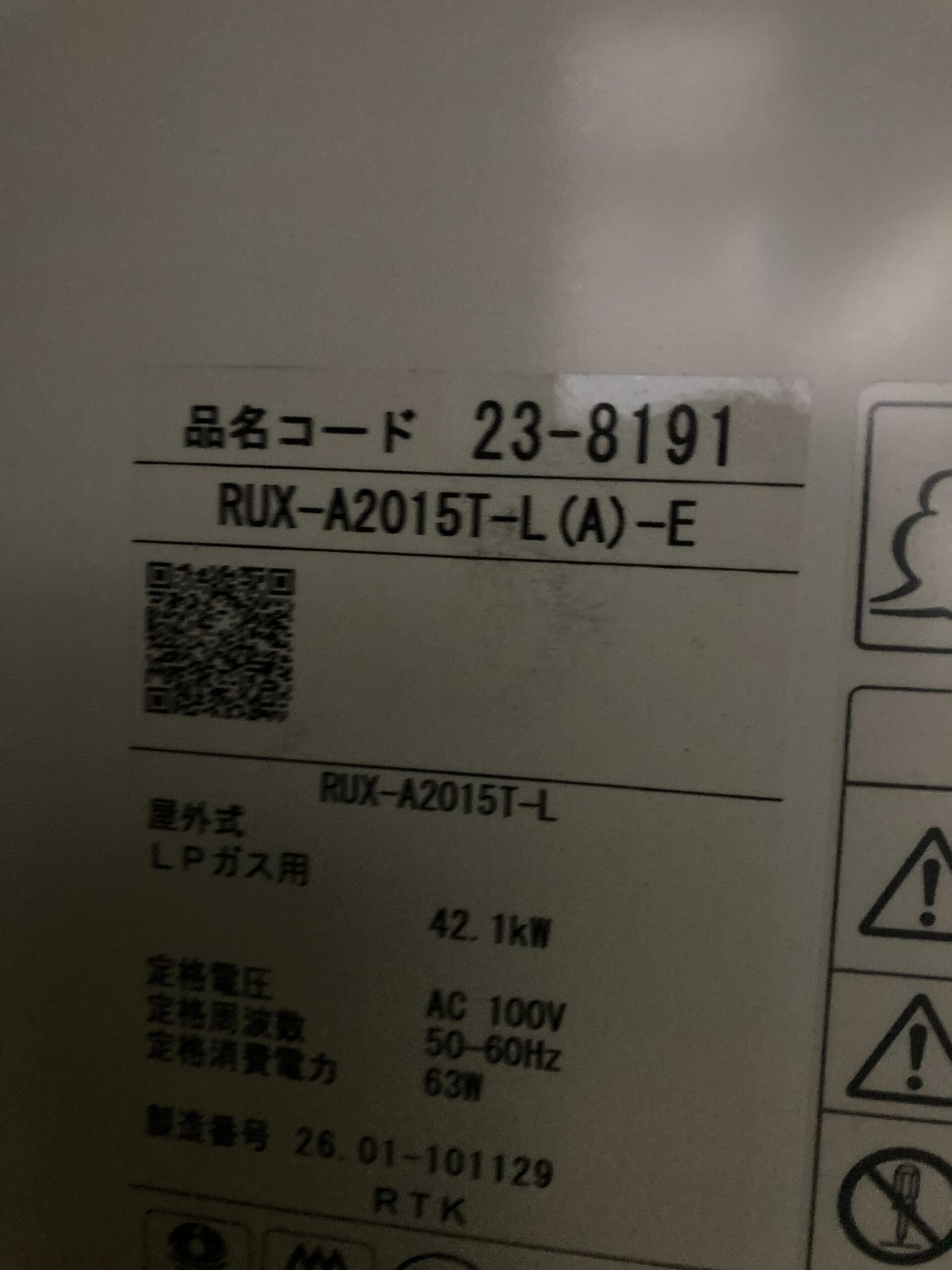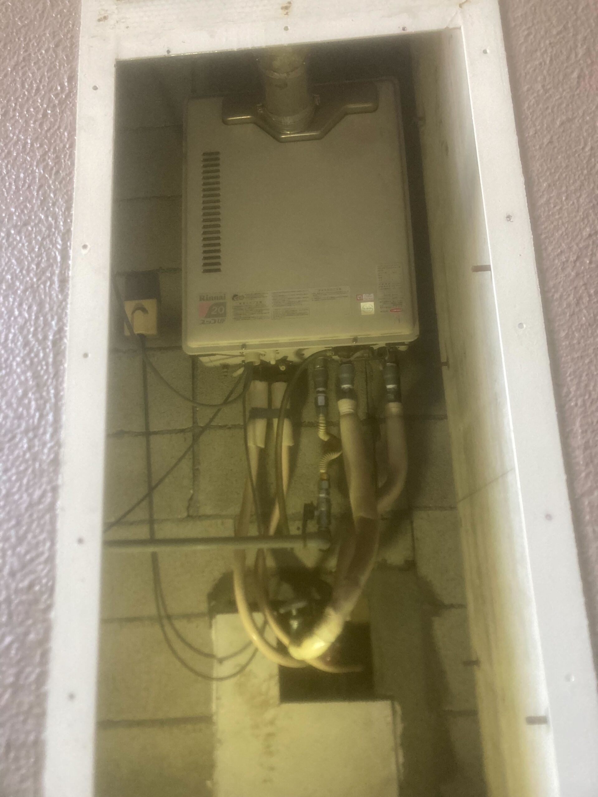 現地確認をしたところ、交換にあたりマンション用の給湯器が必要でしたが、弊社では戸建てやアパートのお客様が多く、今回の交換に必要な扉内設置型(延長前排気型)給湯器の在庫がなかったためメーカーへ注文し入荷を待ってから交換工事を行いました。