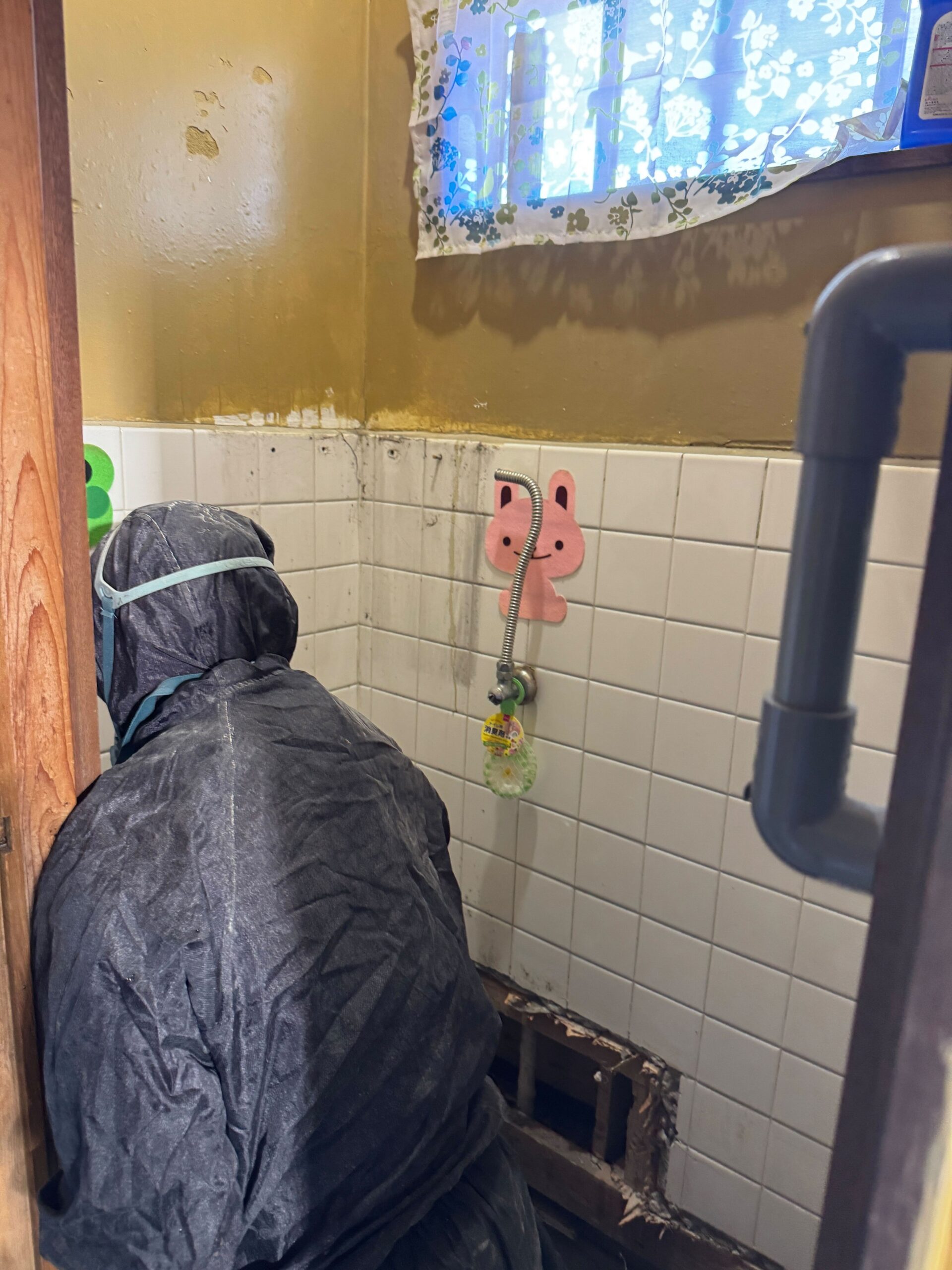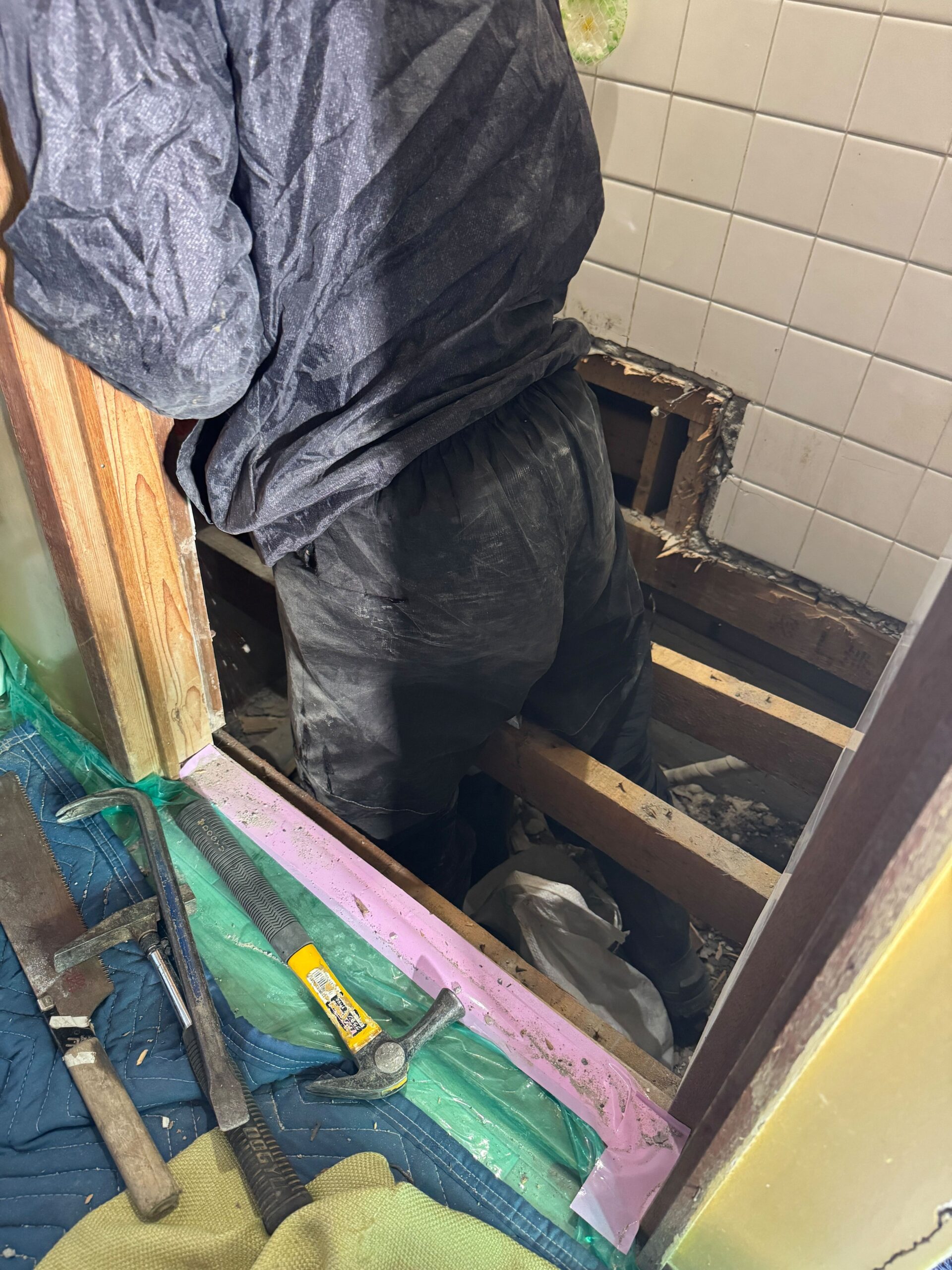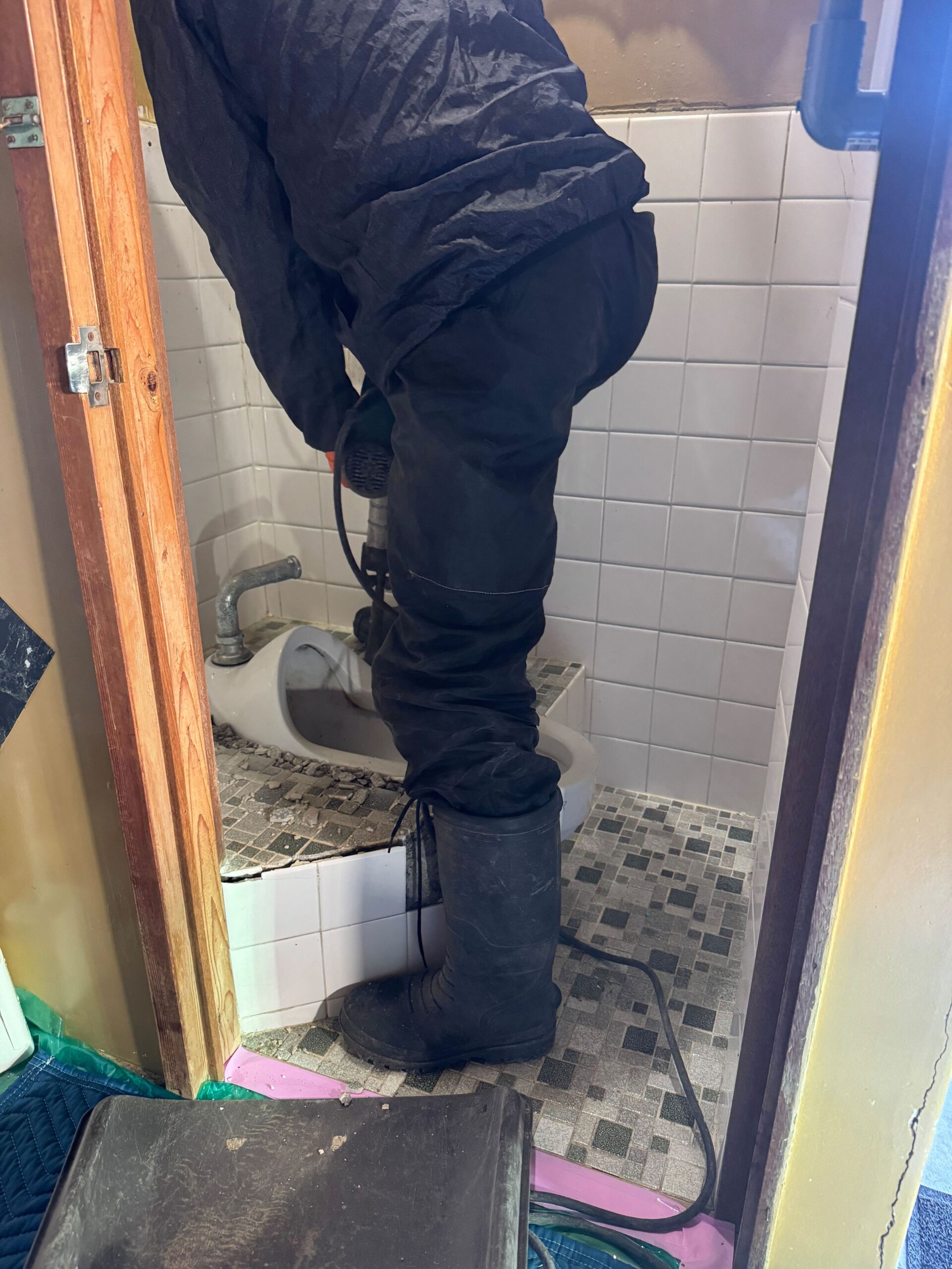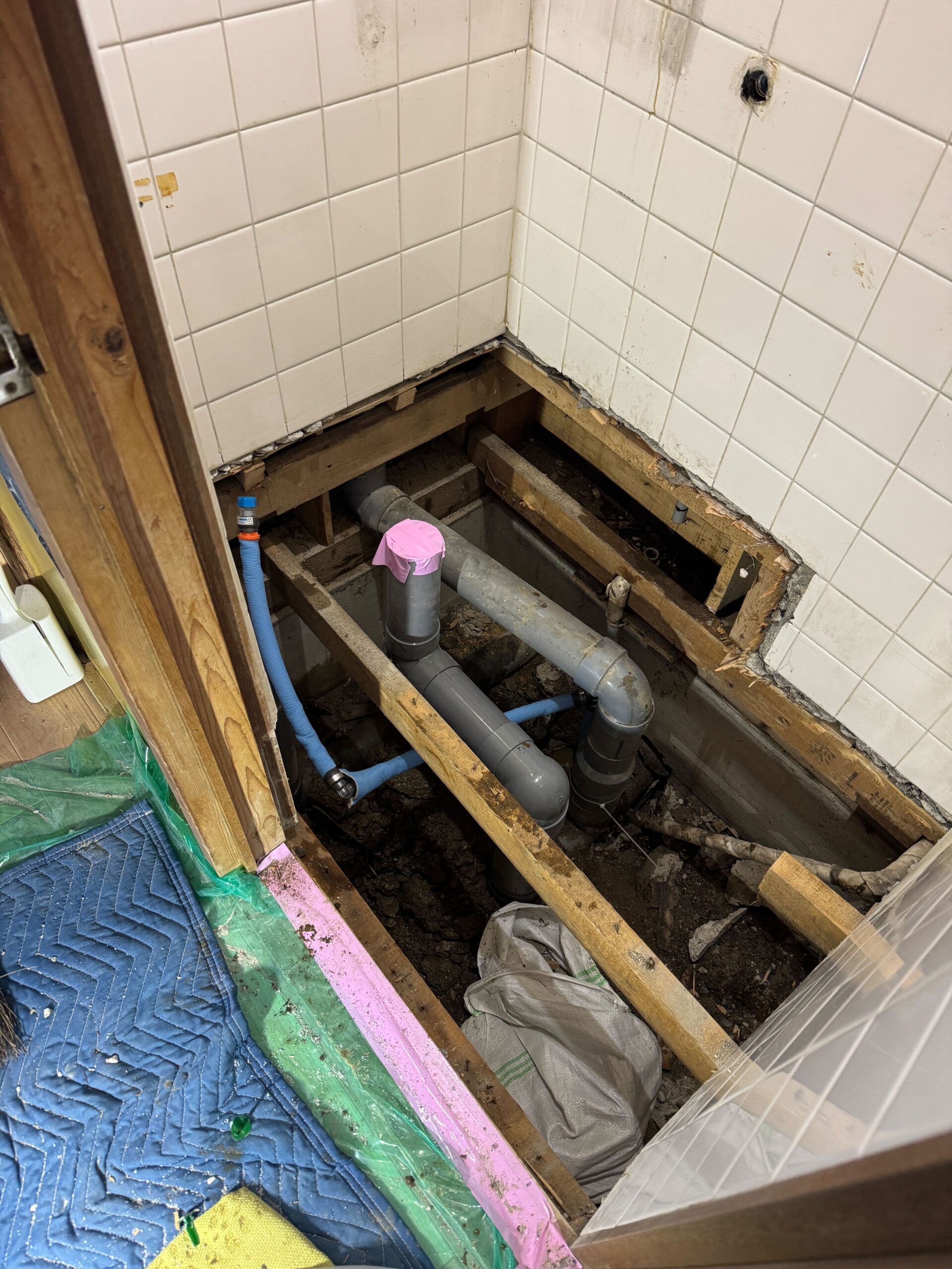 もともとの和式トイレを解体し、解体後は逆勾配になっていた排水配管の入れ替えと給水配管の漏水補修も行いました。