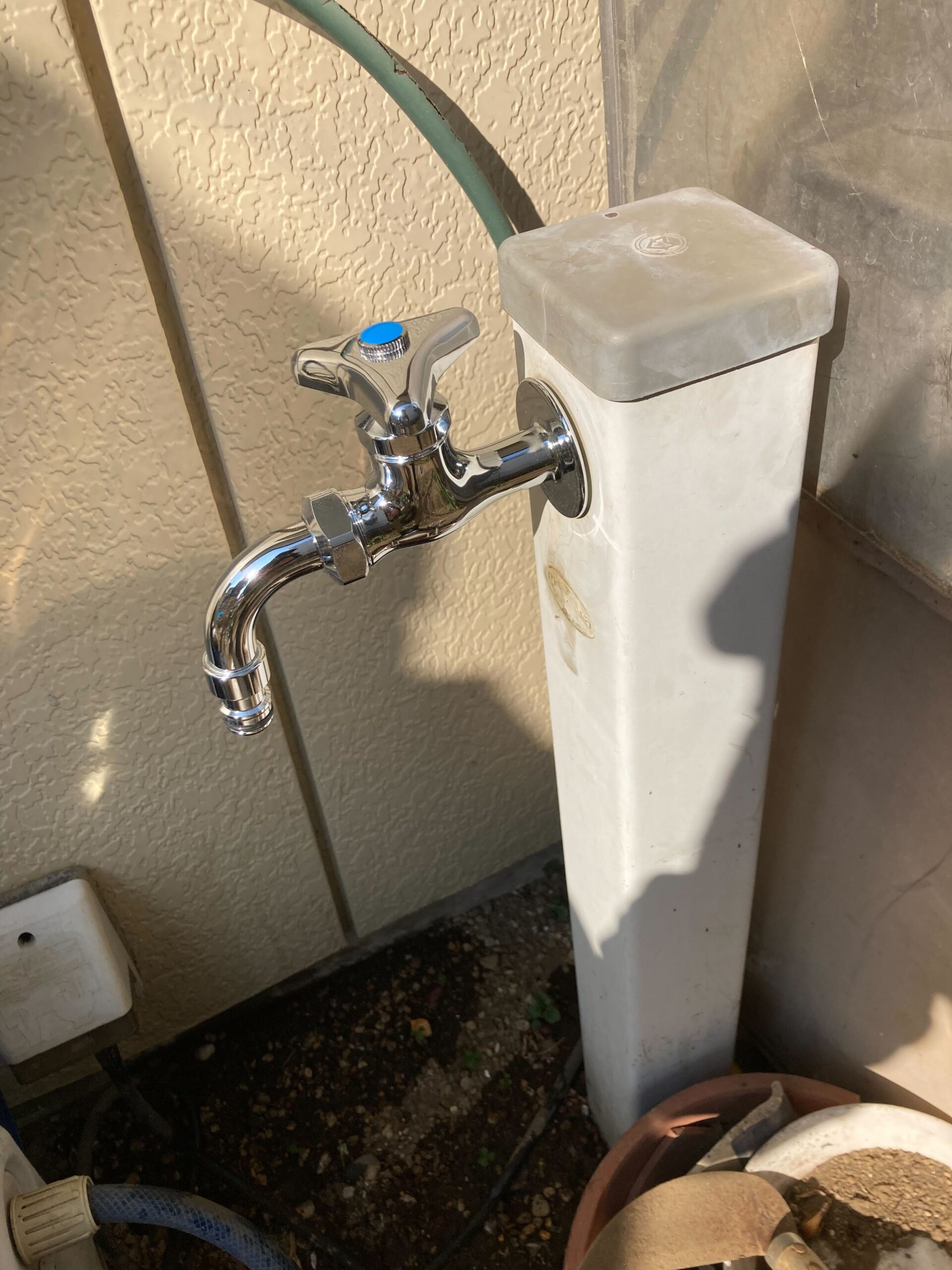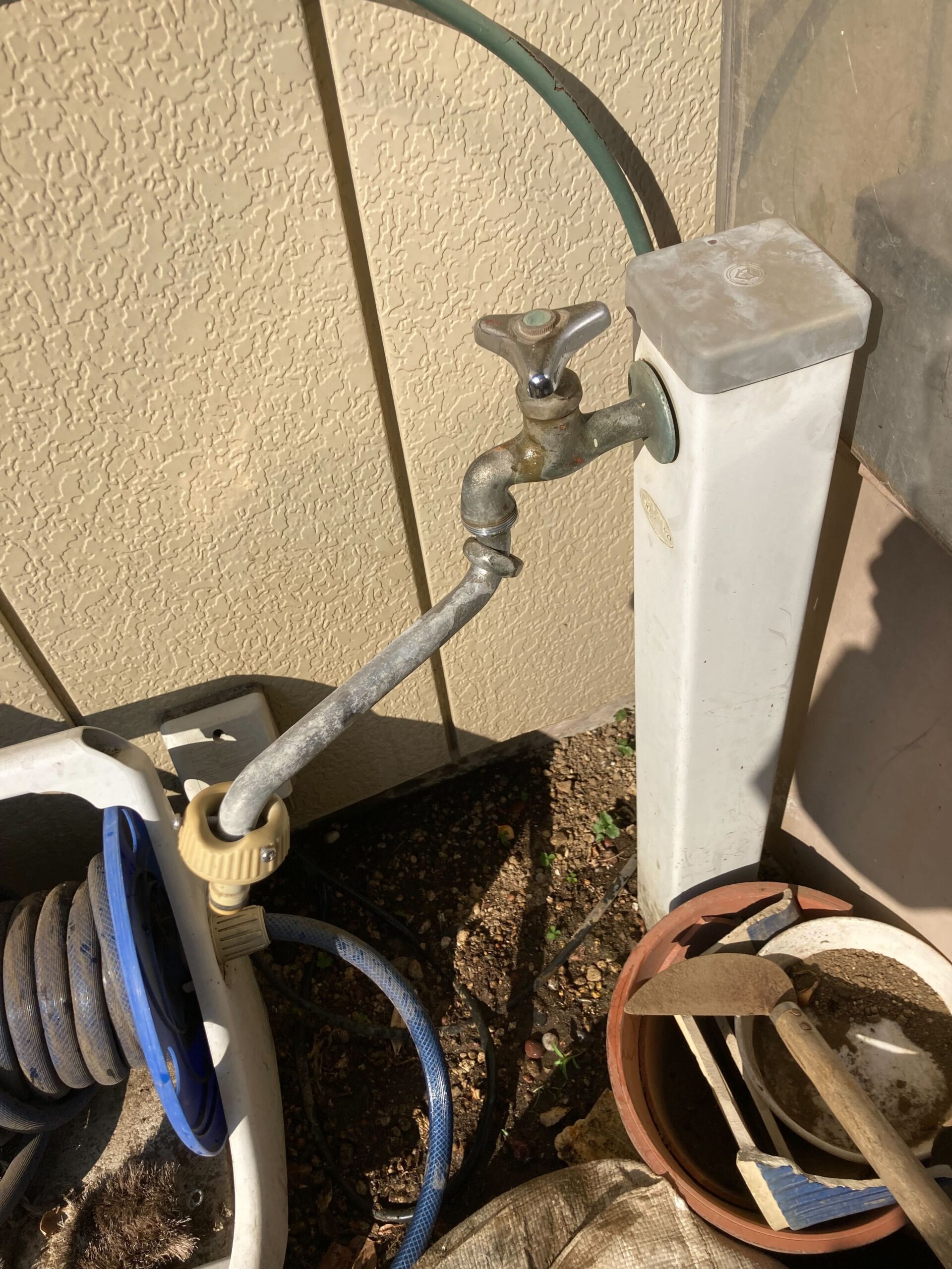 外水栓の交換におうかがいしました! 「水栓の途中から水が漏れてしまって吐水口から水が出ない」とご相談をくださっていたお客様邸です。 水栓本体に劣化がみられた為、今回は故障と判断。新しく交換することをご提案させていただきました。