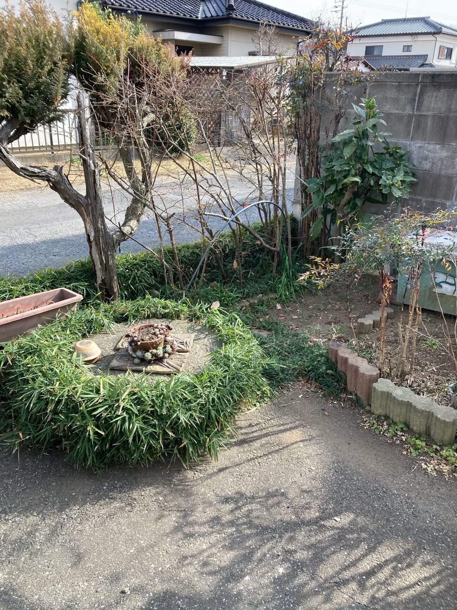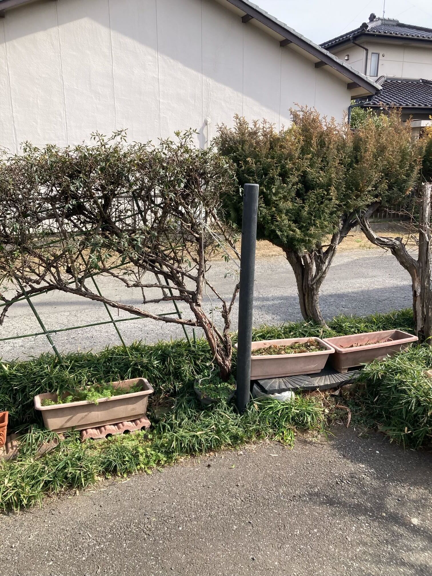 そのまま伐採だけをおこなうと植木の支えがなくなってしまいますので、今回は伐採後、代わりになる杭を新しく打ち込むといった施工を行いました。 杭の設置位置や角度に配慮することで、道路側の木もしっかり支えられるようになっています。 道路側の安全を確保しつつ、お庭の景観も損なわず整えることができました(^^♪