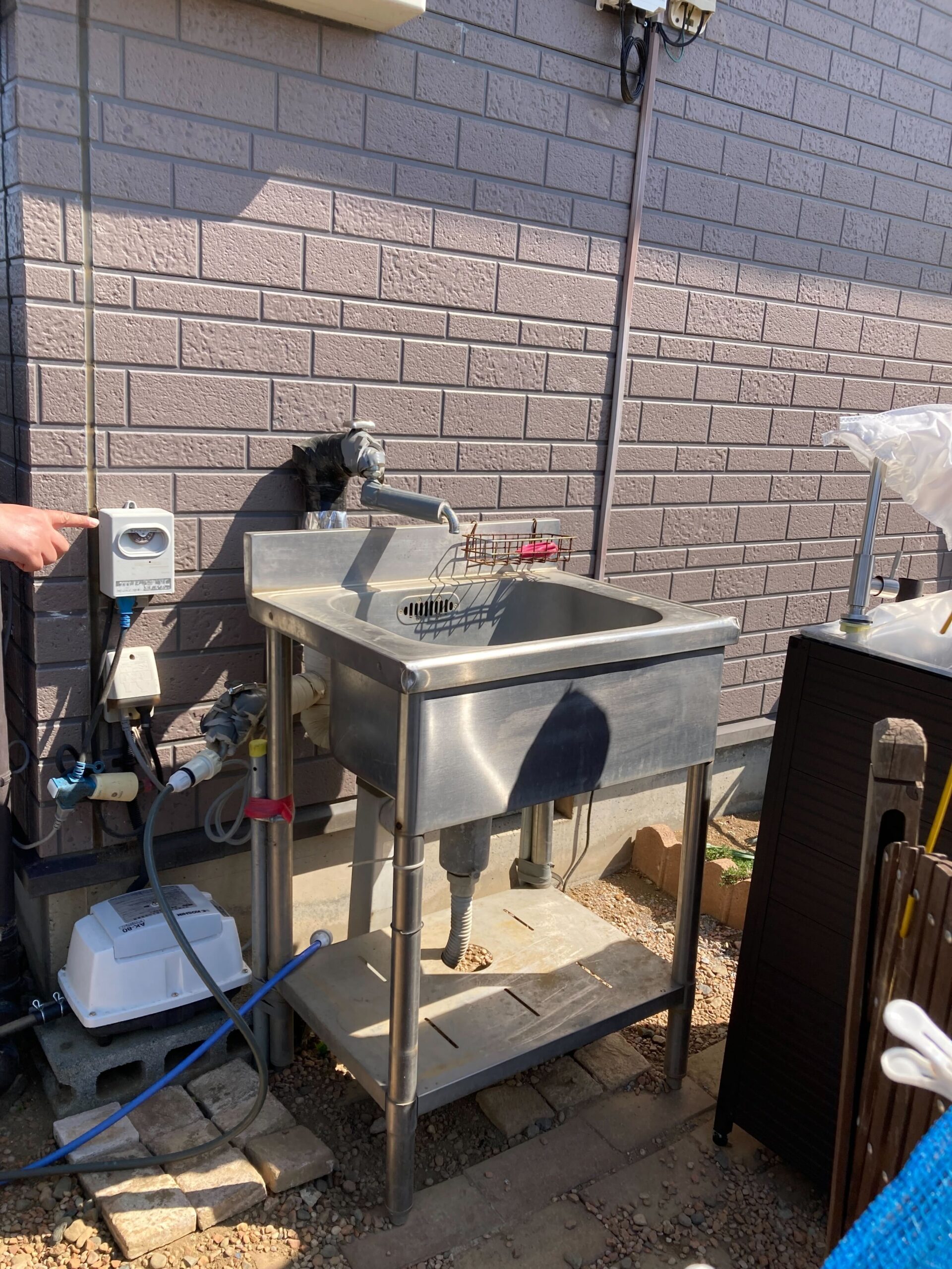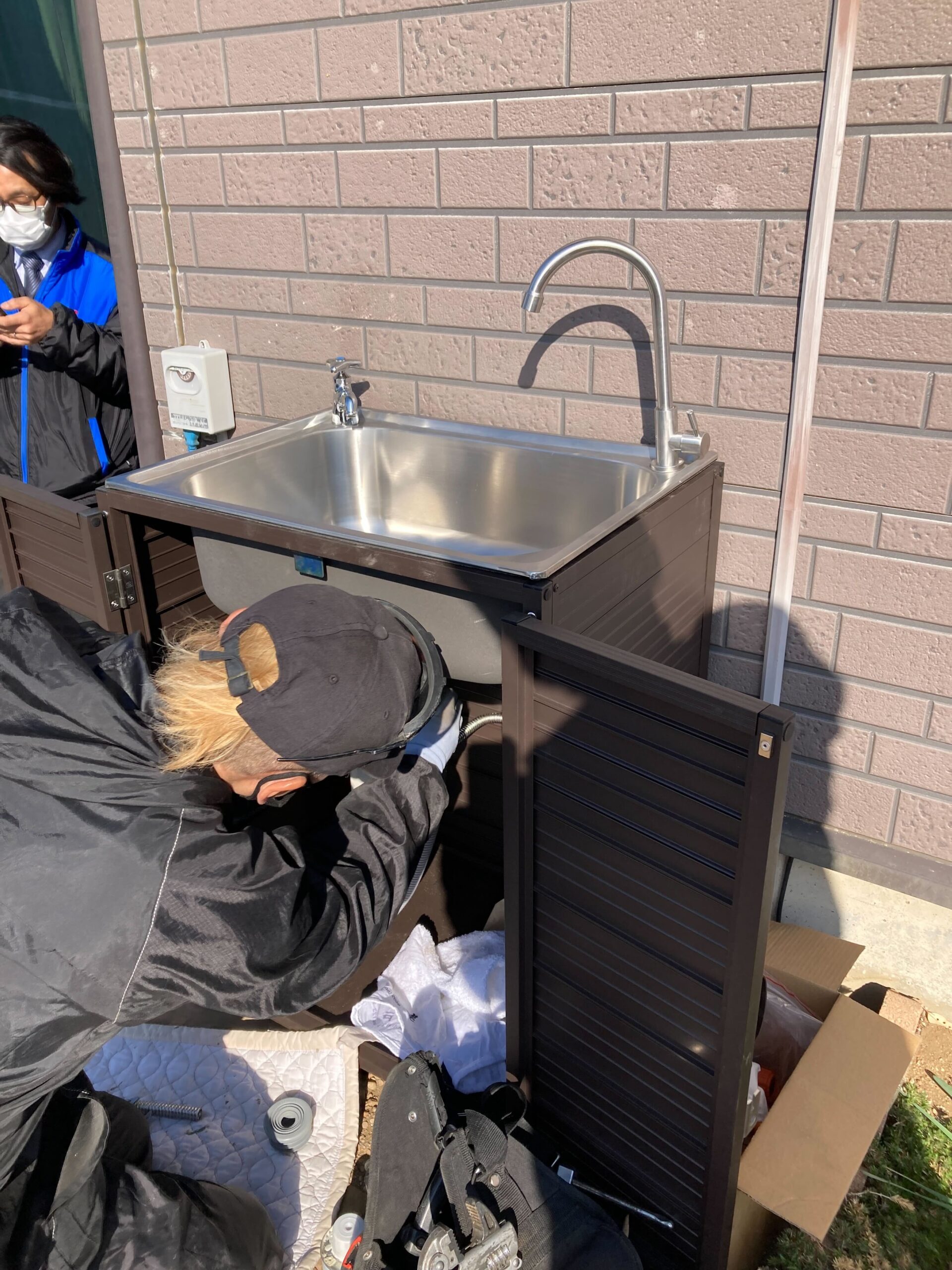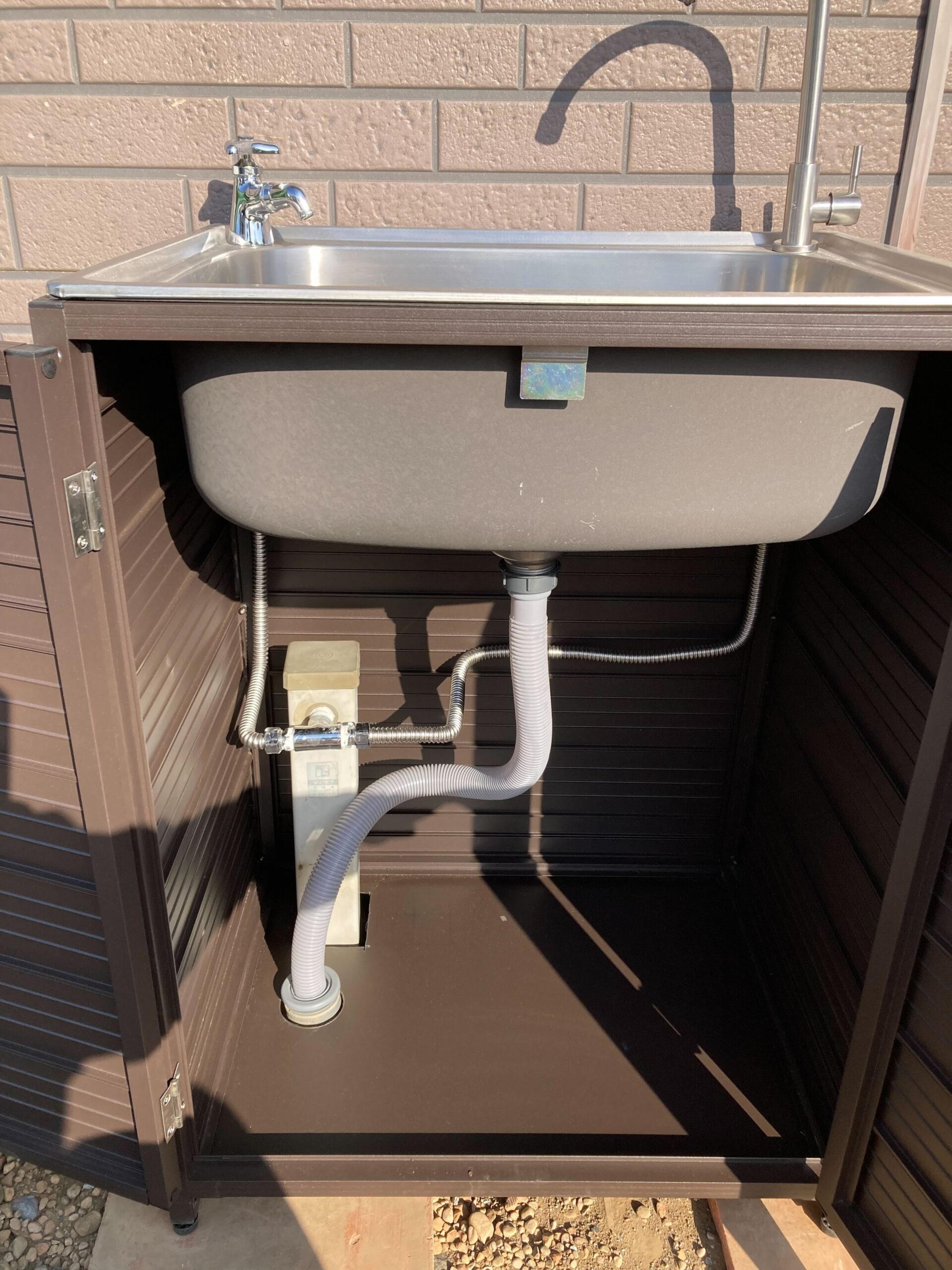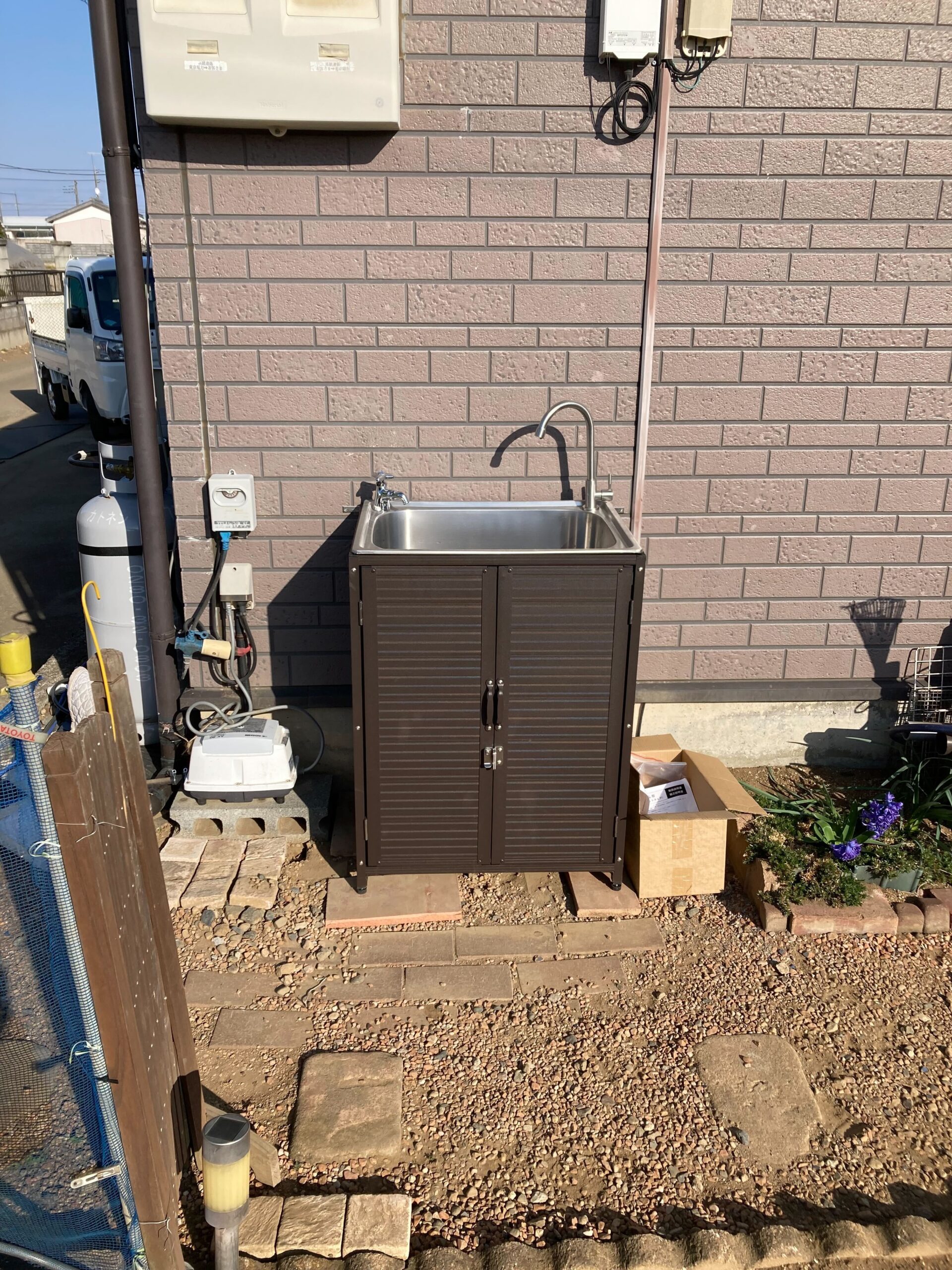 外水栓とシンクの取付におうかがいしました! もともとあった水栓とシンクを外して、新しく取付。 新しい水栓はシンク下に隠しているのでスタイリッシュながらも、以前より安定した設置方法になっております。 シンク自体も扉がついているので収納もバッチリですね♪