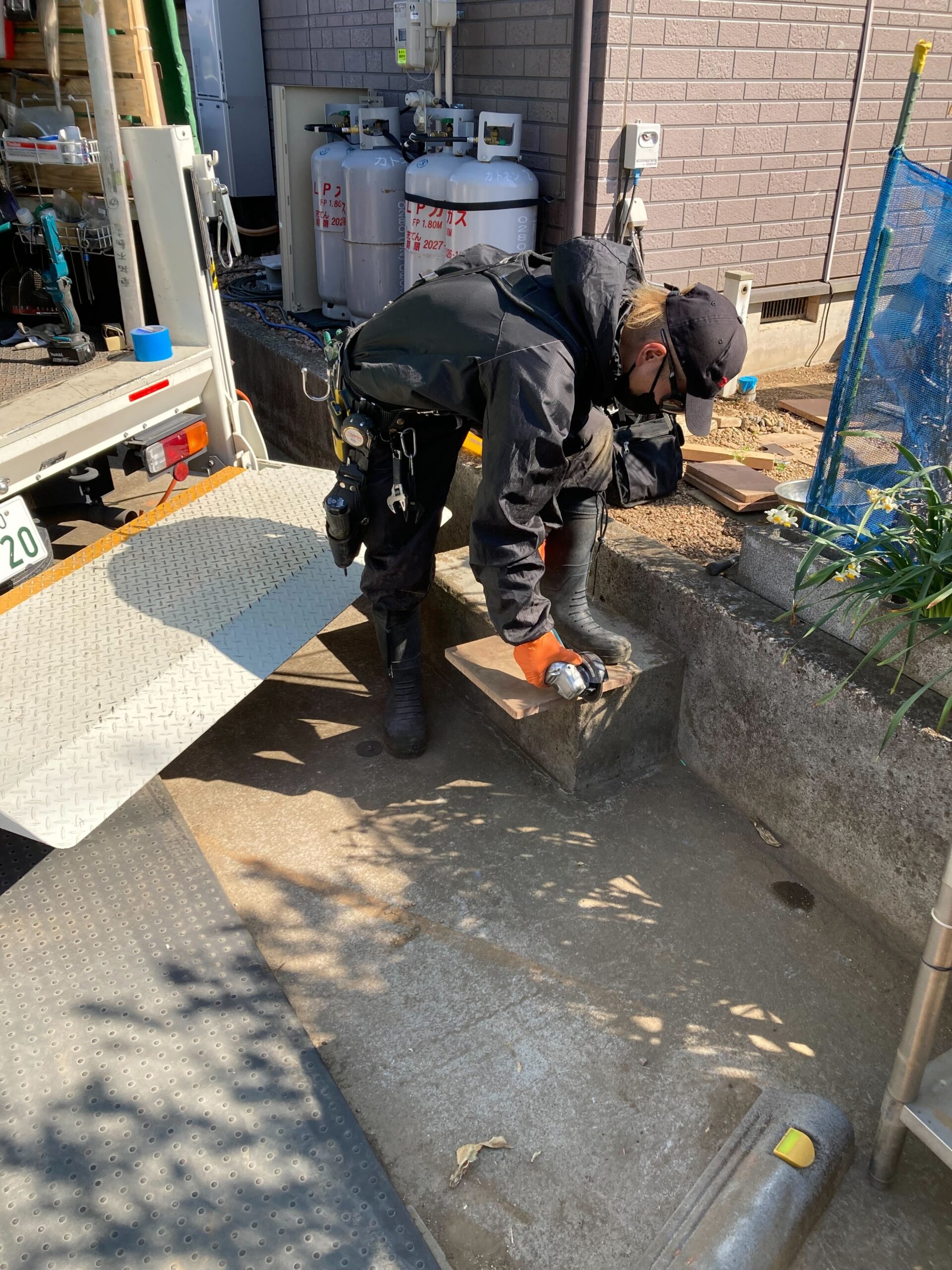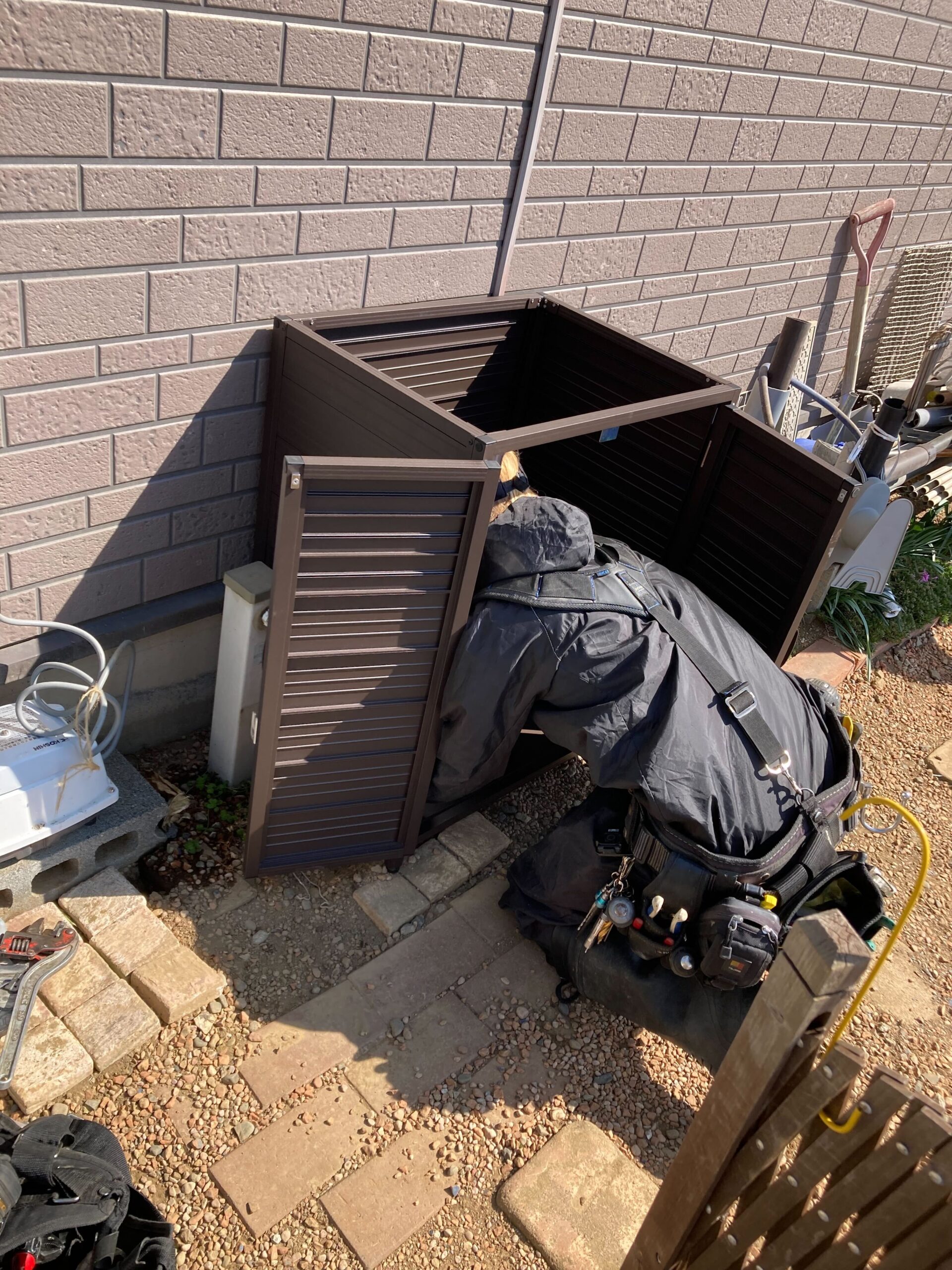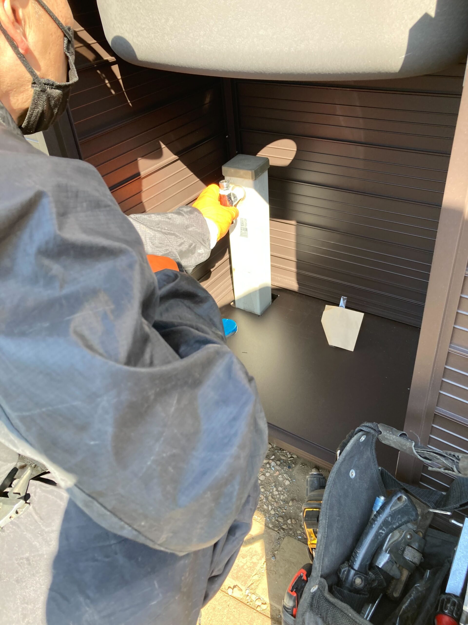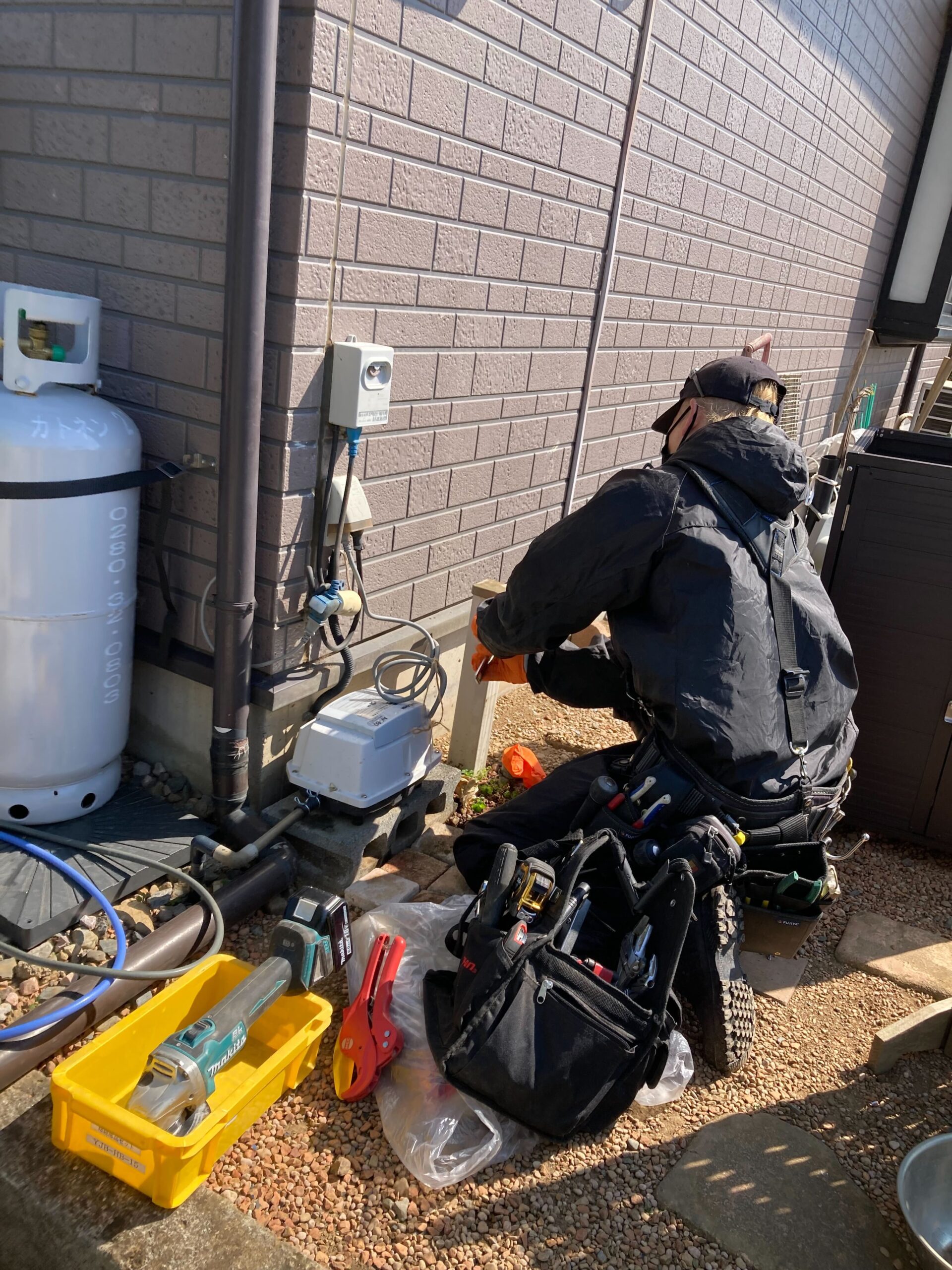 外水栓とシンクの取付におうかがいしました! もともとあった水栓とシンクを外して、新しく取付。 新しい水栓はシンク下に隠しているのでスタイリッシュながらも、以前より安定した設置方法になっております。 シンク自体も扉がついているので収納もバッチリですね♪