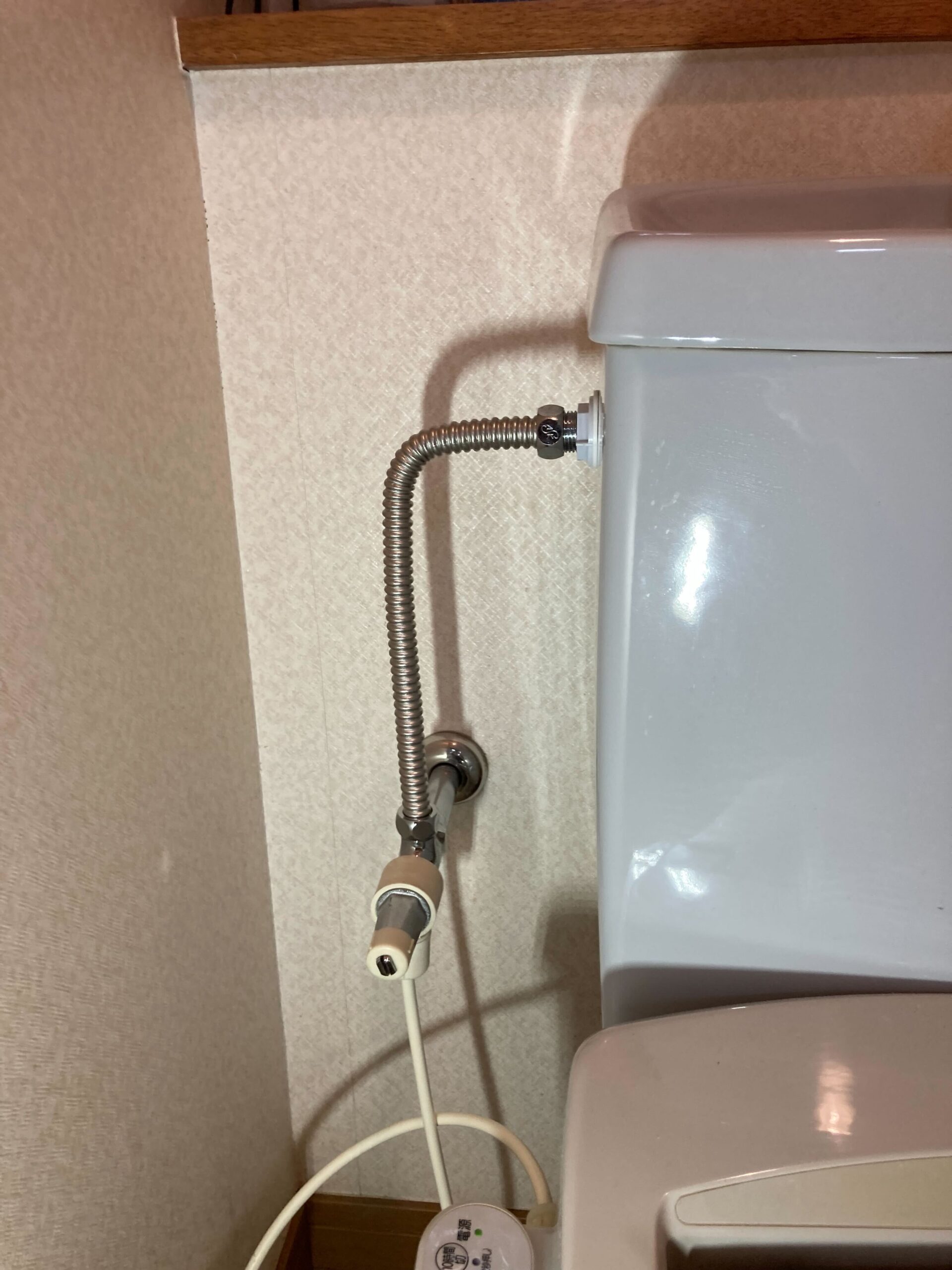 タンク横の給水管(フレキ管)が劣化し、そこから水漏れがありましたのでフレキ管を交換して対応させていただきました。