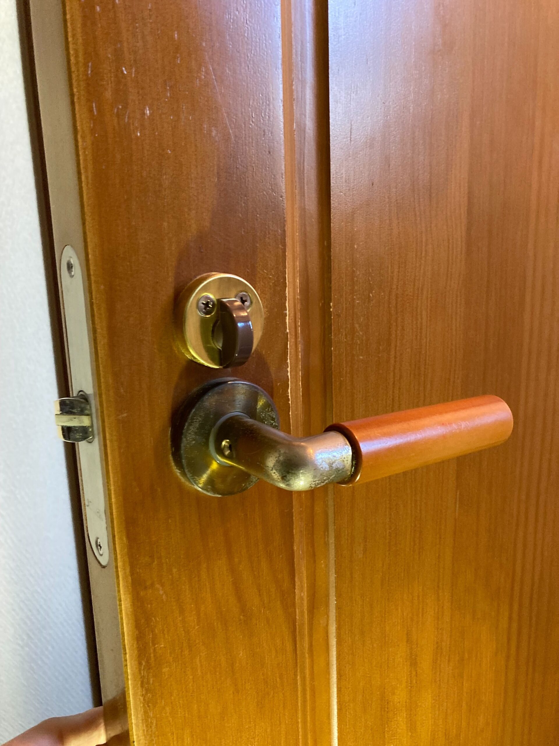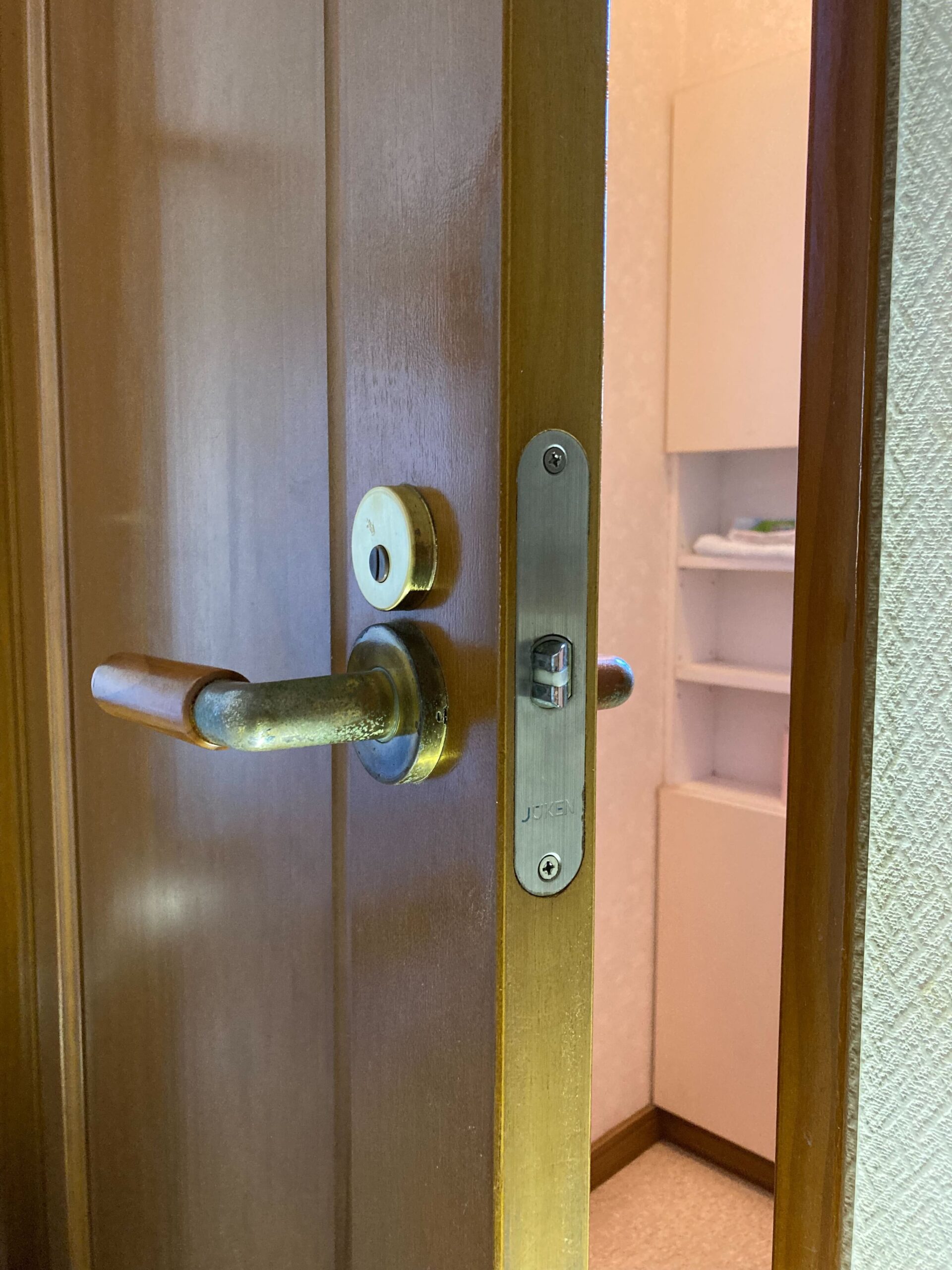 トイレのドアノブが取れてしまったとのことでご相談をいただき、おうかがいしました。 事前にノブや鍵の種類、サイズなどを確認。 今回はケースロックタイプのものが付いていましたので同タイプのものを新しく用意し、交換いたしました。 (ノブとカギは内部で連動していますので単純にノブだけを交換するのではなく、カギも併せて交換いたしました)