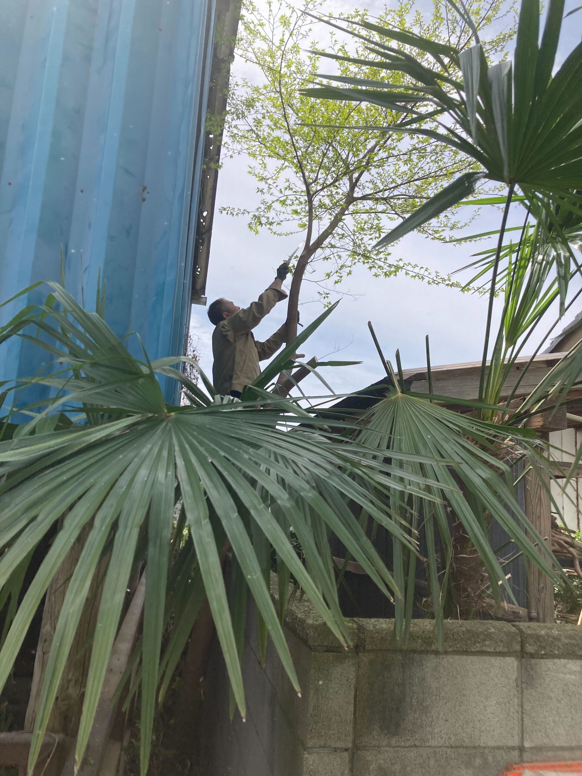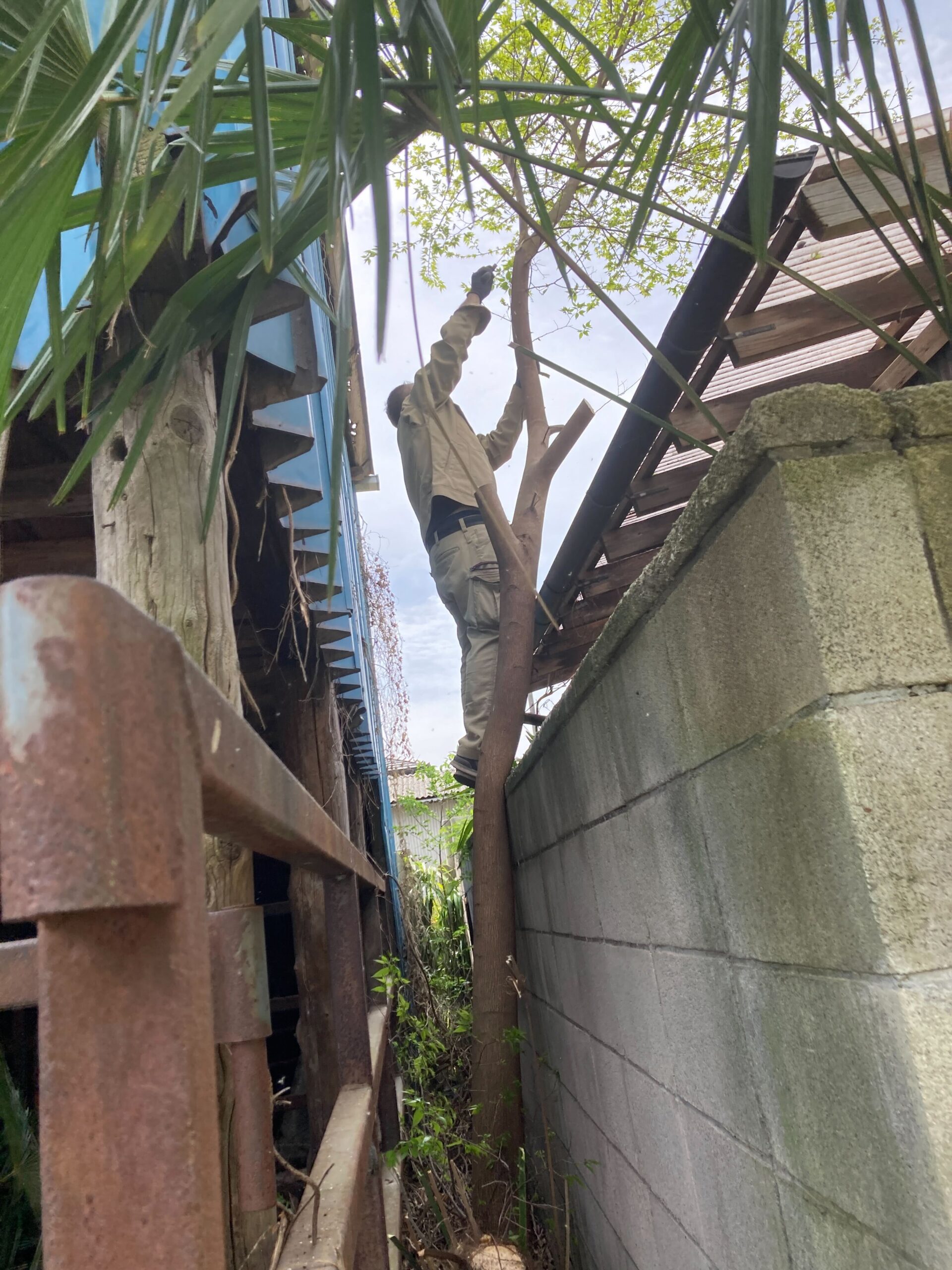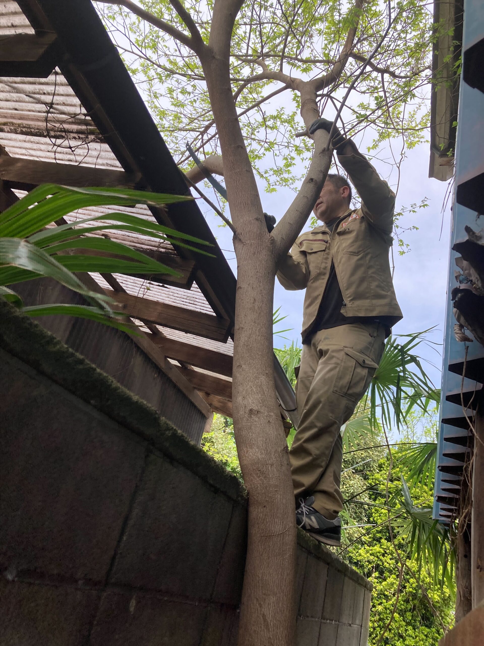 木が大きくなってしまい、お隣のカーポートよりも高く、塀を越えて枝が伸びている状態でした。