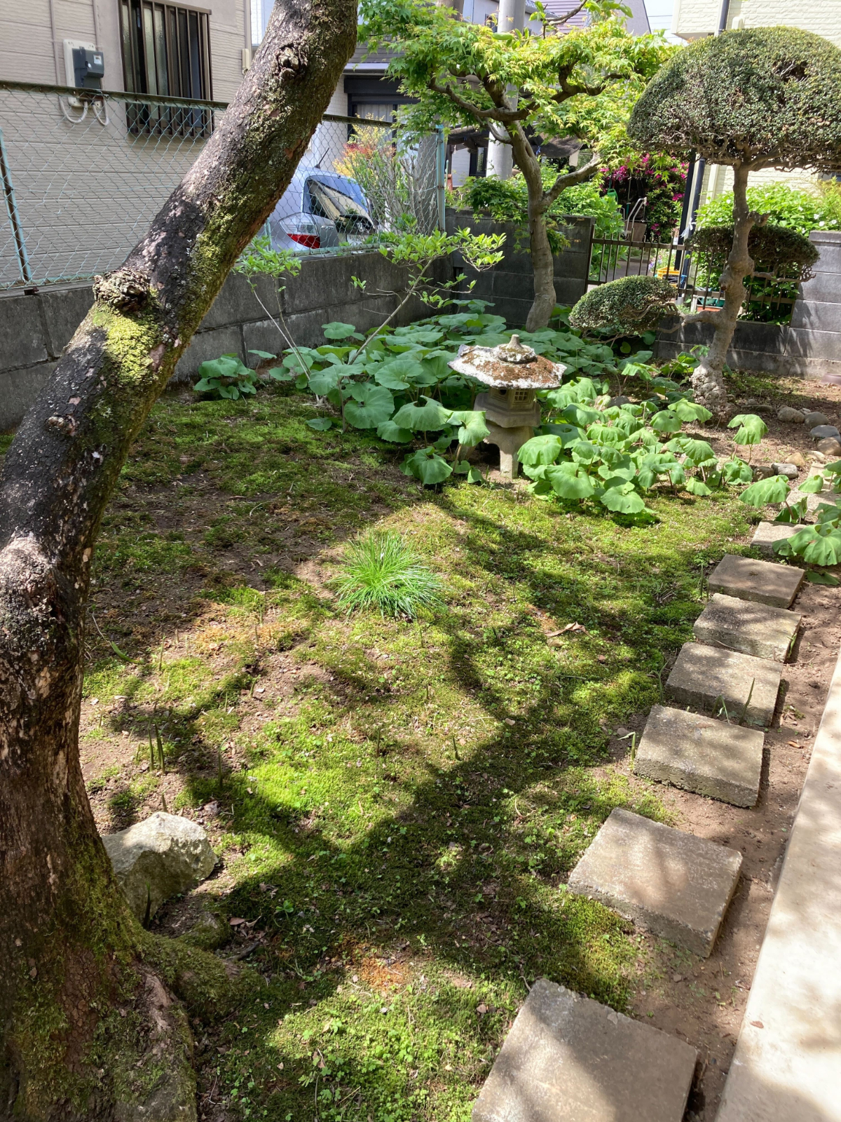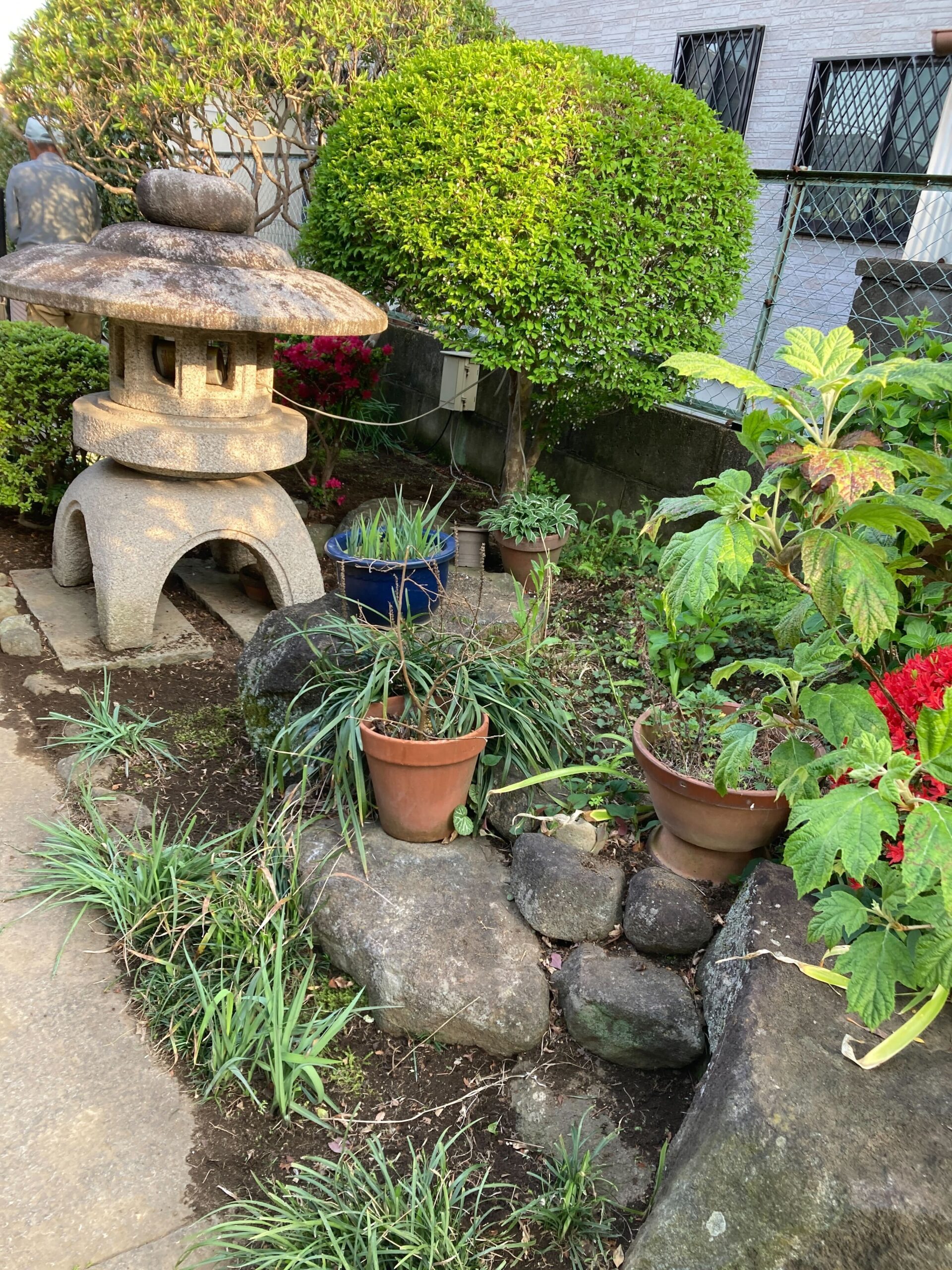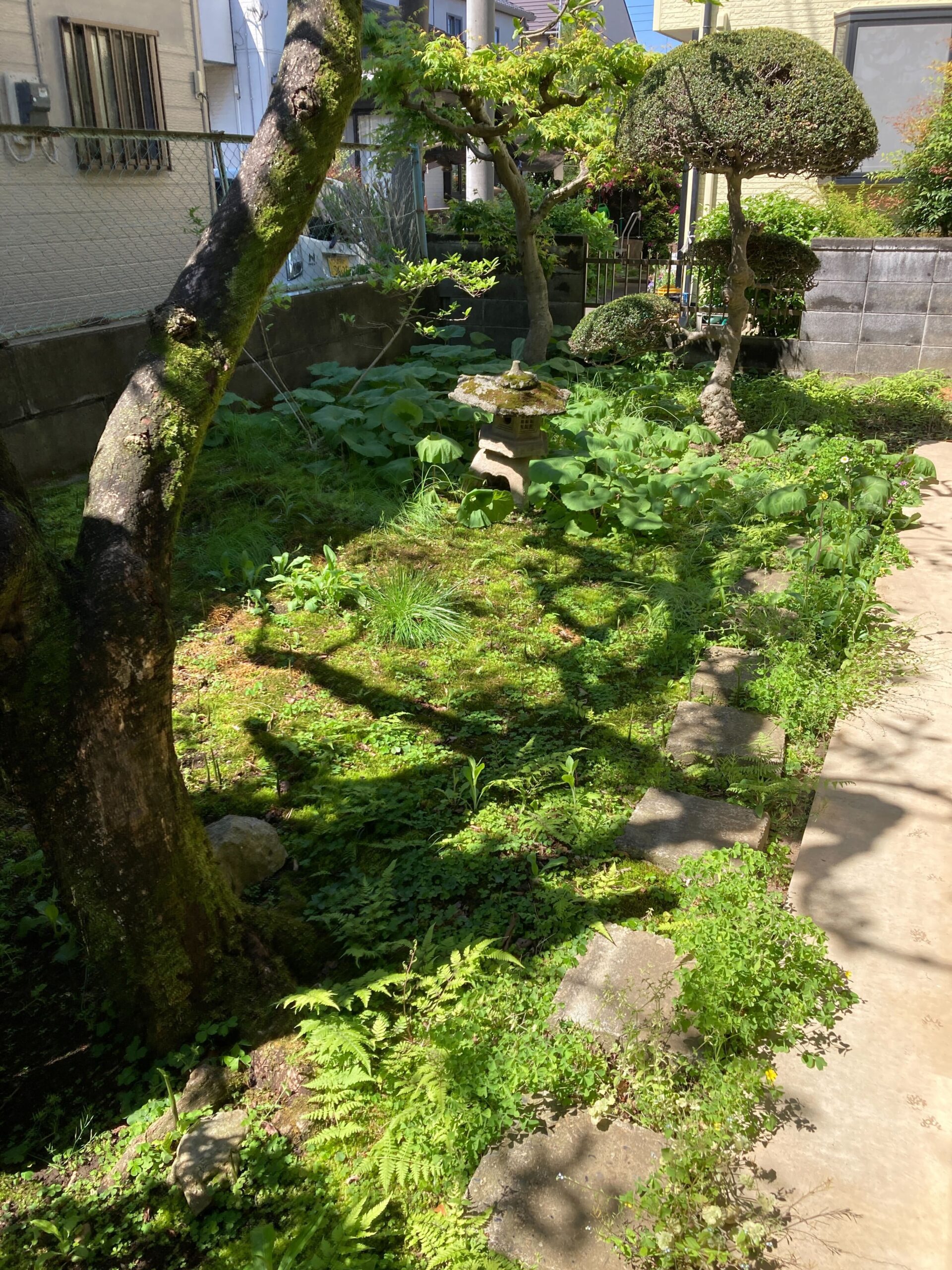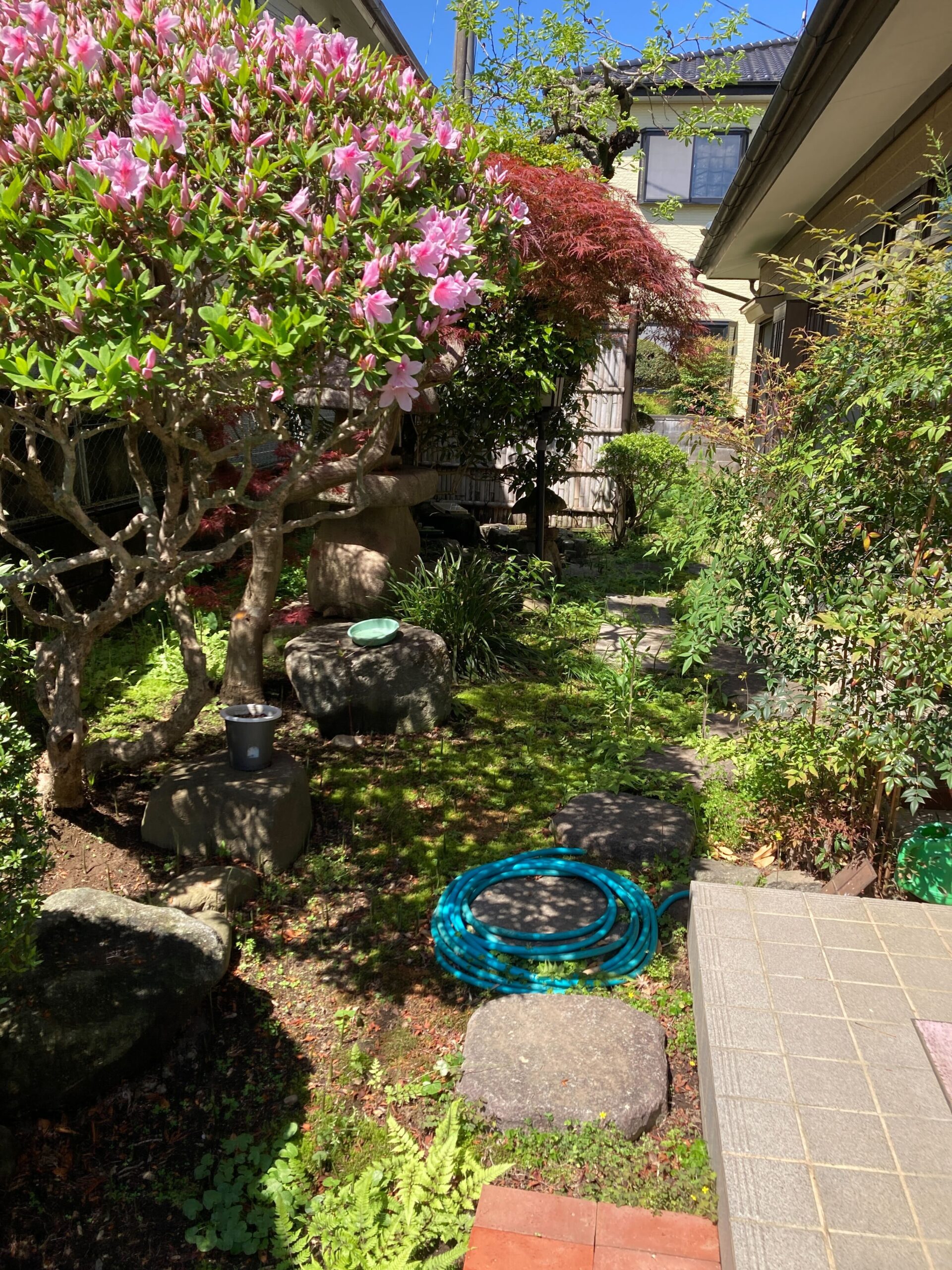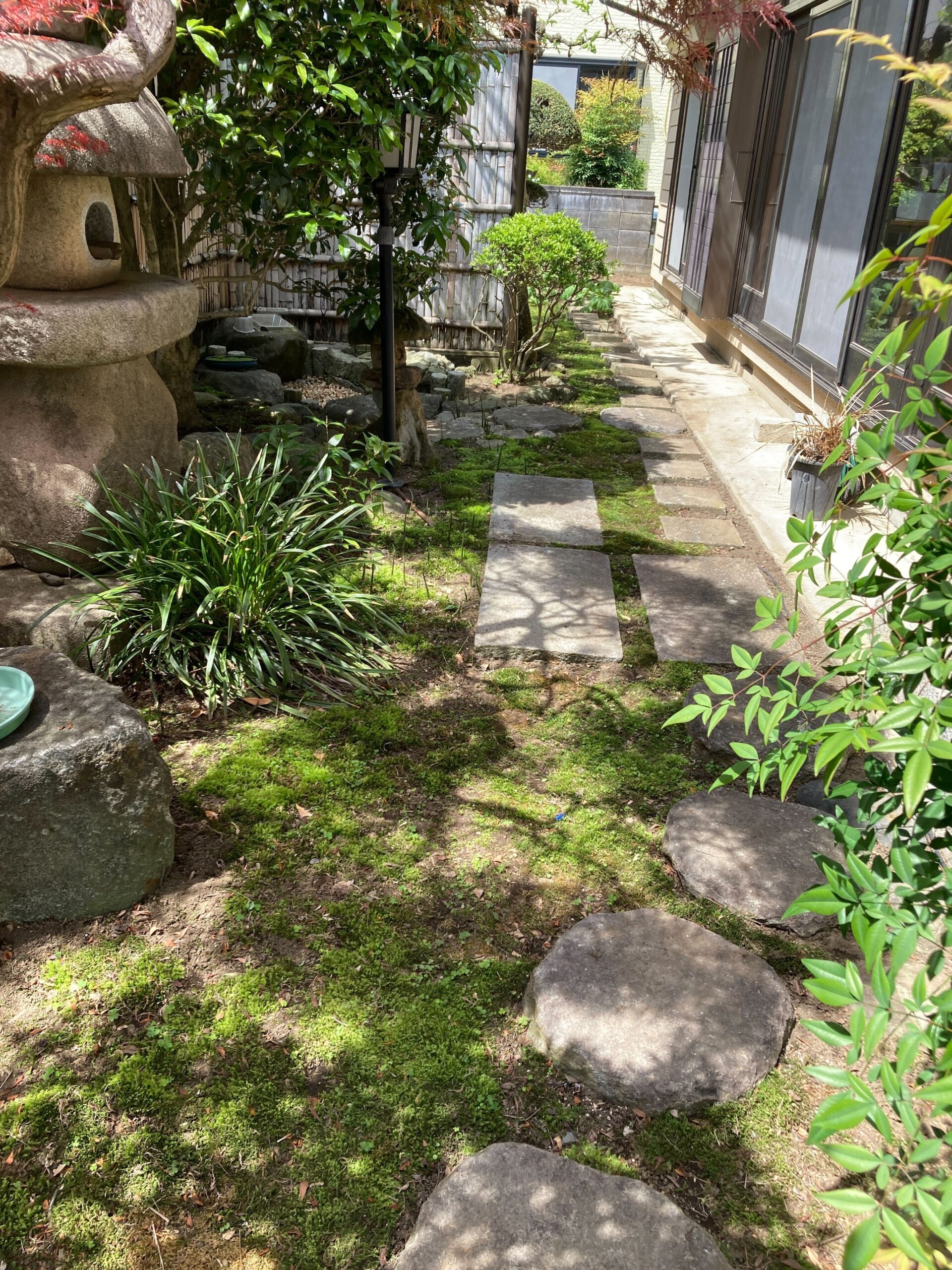 お庭は庭石や敷石、灯籠、植木などが配置された空間で、大切にお手入れされてきた様子が感じられました。